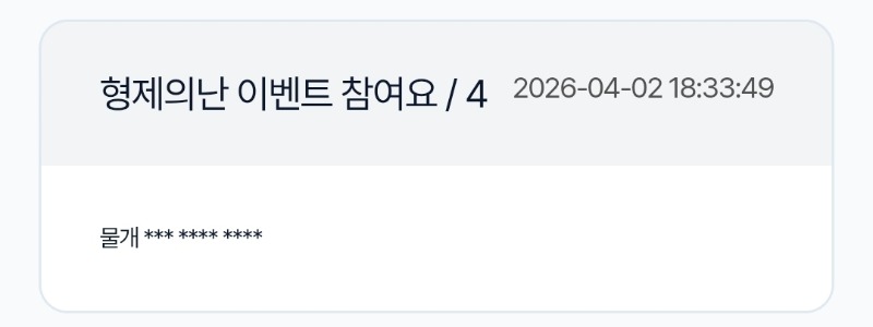 시안형난~` 미친나비 1 0 0 18:42:03 *기프티콘 바코드 노출 주의* <- 가보자고요!! 0 0 https://seulca1.com/bbs/board.php?bo_table=free&wr_id=3747984 Author 0 0 Lv.9 미친나비 9 6,740,696 (68%) 미친나비님 보유 포인트 : P 2,597,889 +1 04.02 시안형난~` +2 04.02 식사하세요!! 04.02 물개 수익포 감사!! +22 04.02 오라메 387배 +1 04.02 퇴근합니다 ~ 야르!!