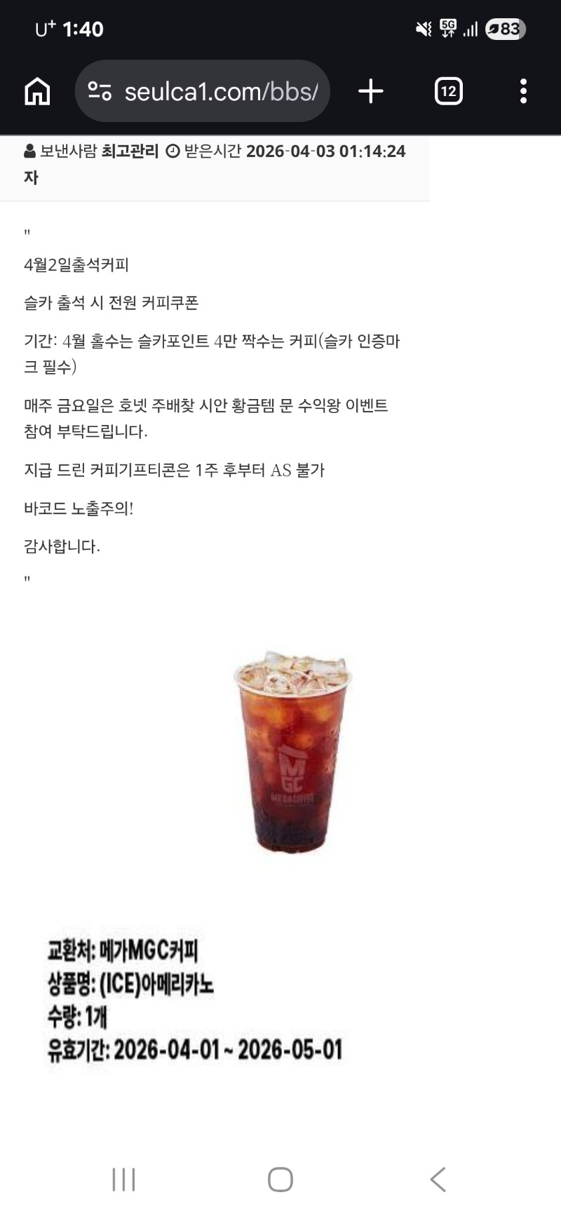 출석커피쿱감사합니다 5G오링 0 0 0 01:42:42 *기프티콘 바코드 노출 주의* <- 감사합니다 0 0 https://seulca1.com/bbs/board.php?bo_table=free&wr_id=3749282 Author 3 0 Lv.13 5G오링 13 22,176,020 (83%) 5G오링님 보유 포인트 : P 2,980,379 04.03 출석커피쿱감사합니다 +2 04.03 100연꽝도전중 10등 +2 04.03 달이형 추겜성공 04.03 렙업다되가네여 04.03 출석완료요