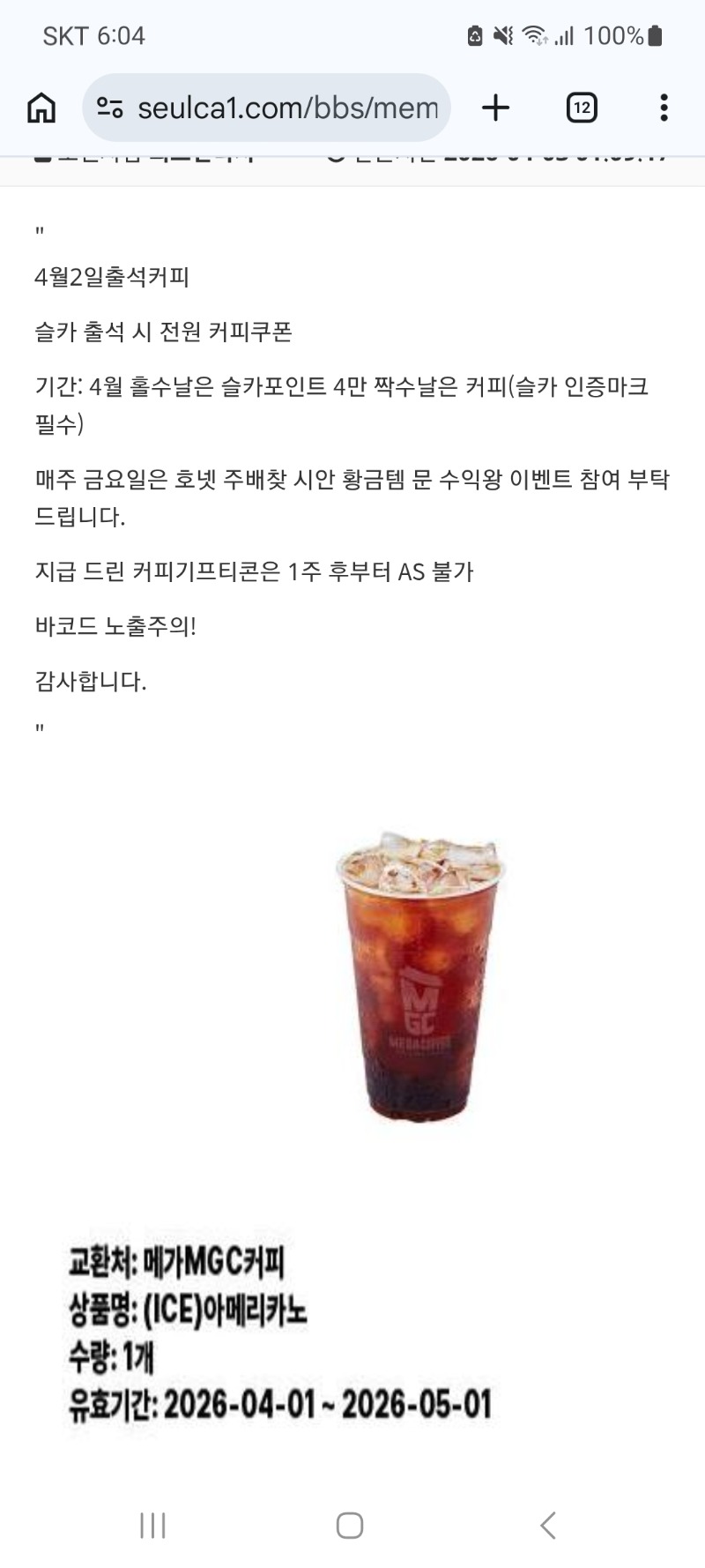 출근길커피 도원유빈 0 0 0 06:12:15 *기프티콘 바코드 노출 주의* <- 감사합니다^^ 0 0 https://seulca1.com/bbs/board.php?bo_table=free&wr_id=3749539 Author 0 0 Lv.9 도원유빈 9 4,034,847 (0%) 도원유빈님 보유 포인트 : P 104,427 +1 04.03 [비밀글] 포인트교환요 04.03 오늘 날씨도 좋네요 04.03 출근길커피 +9 04.03 슈슈317 +9 04.03 슈슈317