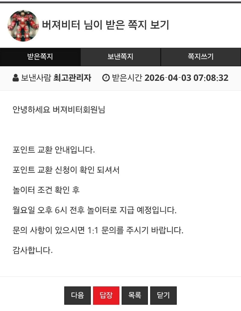일단 포교 완료 버져비터 3 0 0 07:35:33 *기프티콘 바코드 노출 주의* <- 다들 주말이니 포교준비들 하세요~ 출석 안 하신 분들 출석도 챙기시구요~ 0 0 https://seulca1.com/bbs/board.php?bo_table=free&wr_id=3749708 Author 1 1 Lv.9 버져비터 9 4,330,595 (8%) 버져비터님 보유 포인트 : P 1,212,727 +3 04.03 일단 포교 완료 +1 04.03 그러고보니 금요일이네요 +1 04.03 [비밀글] 포인트 교환 신청합니다 04.03 좋은 아침입니다 +6 04.03 역시 운이었나봅니다..2승1패