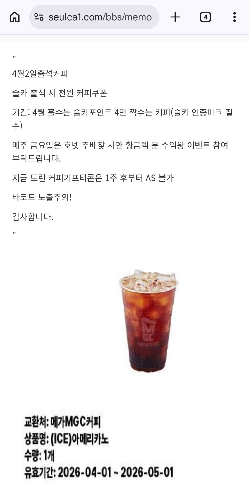 슬카 커피 감사합니다~ 송가든 1 0 0 08:14:15 *기프티콘 바코드 노출 주의* <- 0 0 https://seulca1.com/bbs/board.php?bo_table=free&wr_id=3749779 Author 0 0 Lv.3 송가든 3 84,687 (69%) 송가든님 보유 포인트 : P 350,208 +1 04.03 슬카 커피 감사합니다~ +4 04.03 굿모닝입니다 04.03 이만 자러 갑니다~ +4 04.02 안녕하세요~ +13 04.02 가입인사드립니다