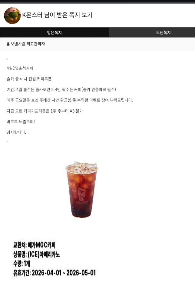 4월 첫출석커피 K몬스터 2 1 0 10:24:27 *기프티콘 바코드 노출 주의* <- 첫번째커피 게또~~ 1 0 https://seulca1.com/bbs/board.php?bo_table=free&wr_id=3750082 Author 12 3 Lv.15 K몬스터 15 41,571,661 (57%) K몬스터님 보유 포인트 : P 2,058 +2 04.03 4월 첫출석커피 +5 04.03 일보기10등당첨 +6 04.02 사자 럭포 슈웃~~ +20 04.01 배당왕4등당첨 +2 03.31 시안 미형 행운번호 당첨