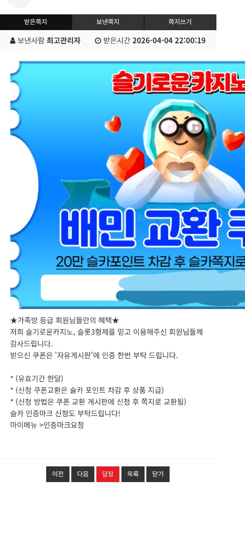가족방 배민 에어팡 2 0 0 12:15:03 *기프티콘 바코드 노출 주의* <- 감사합니다 0 0 https://seulca1.com/bbs/board.php?bo_table=free&wr_id=3757125 Author 4 4 Lv.14 에어팡 14 23,861,036 (12%) 에어팡님 보유 포인트 : P 201,104 +42 04.05 슈천 5149배 +1 04.05 [비밀글] 교환 +11 04.05 슈슈 189배 04.05 맛점하세요 +2 04.05 가족방 배민