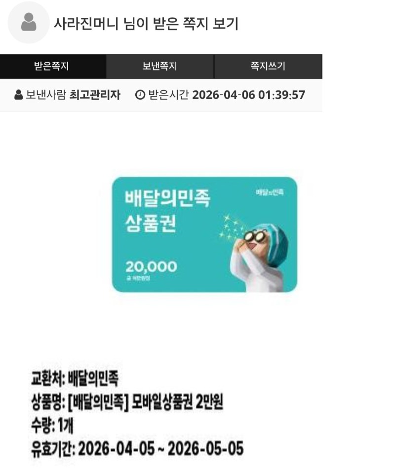 가족방 배민쿠폰 감사합니다 사라진머니 0 0 0 04.06 01:50 *기프티콘 바코드 노출 주의* <- 0 0 https://seulca1.com/bbs/board.php?bo_table=free&wr_id=3759693 Author 0 0 Lv.6 사라진머니 6 1,509,280 (50%) 사라진머니님 보유 포인트 : P 2,019 +2 04.07 주복 10등 당첨 감사용 04.06 굿모닝입니다. 04.06 가족방 배민쿠폰 감사합니다 +1 04.06 [비밀글] 쿠폰교환 +3 04.06 일복2등당첨