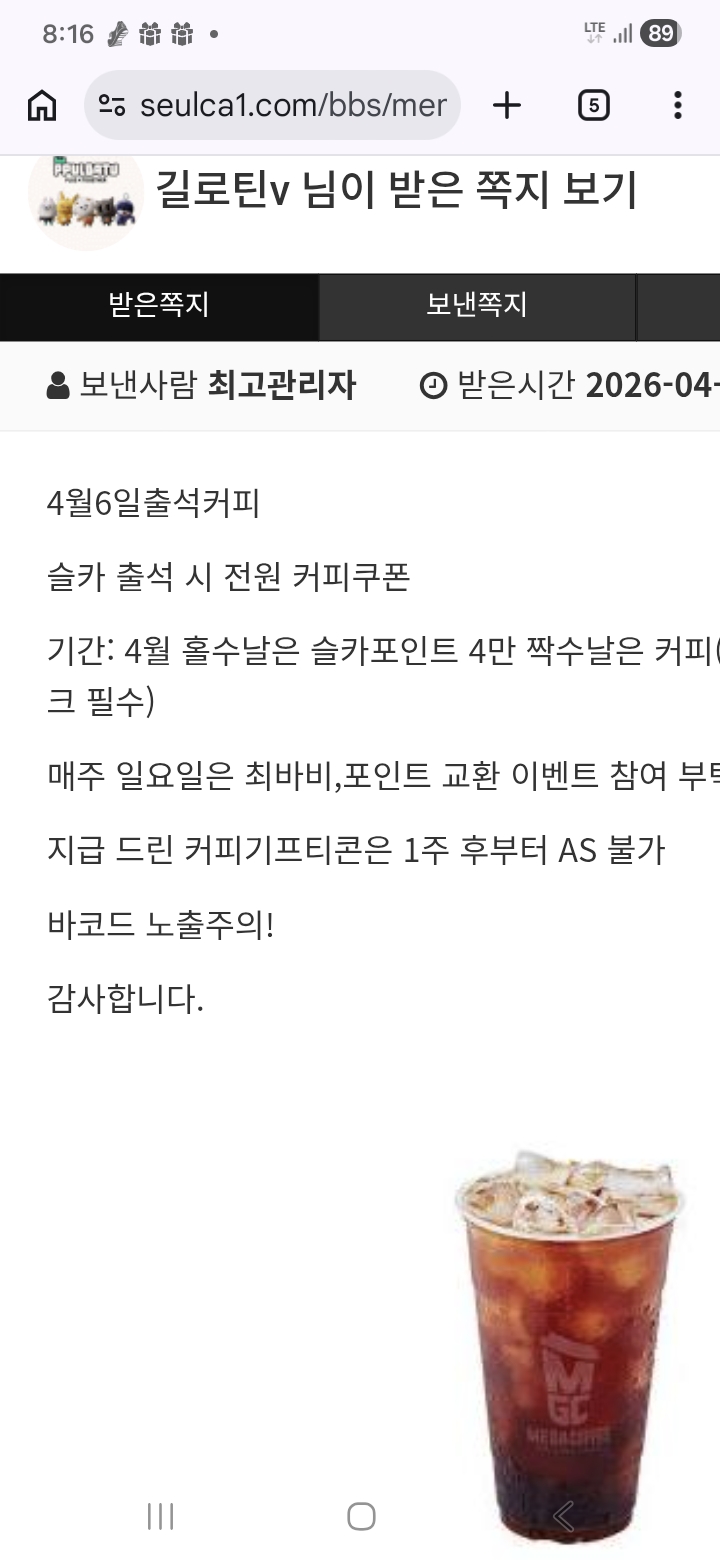 출석커피 ㅅㅅ 길로틴v 1 0 0 04.07 08:17 *기프티콘 바코드 노출 주의* <- 0 0 https://seulca1.com/bbs/board.php?bo_table=free&wr_id=3763507 Author 8 1 Lv.12 길로틴v 12 15,187,638 (43%) 길로틴v님 보유 포인트 : P 1,240 04.09 비가꽤오네요 맛점들 하세요 +1 04.09 출석커피 감사 +4 04.08 딸내미 먹일 떡볶이요리중 ^^ +4 04.08 연속 일복 7등 당첨 +7 04.08 일복 3등 당첨