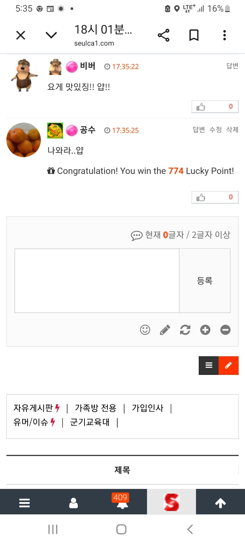 간만에 나온 럭포.ㅋ 공수 2 0 0 04.07 17:36 *기프티콘 바코드 노출 주의* <- 0 0 https://seulca1.com/bbs/board.php?bo_table=free&wr_id=3765006 Author 3 0 Lv.12 공수 12 16,052,486 (61%) 공수님 보유 포인트 : P 104,843 +1 04.09 아침 먹고 쉬는중 이네요 +6 04.08 오늘의 1등은 누구인가? +12 04.08 이재미에 복권 긁는다.ㅋㅋ 일복5등이네 +2 04.08 이번주도 강제 단도네요... +2 04.08 참지 못하고 결국...