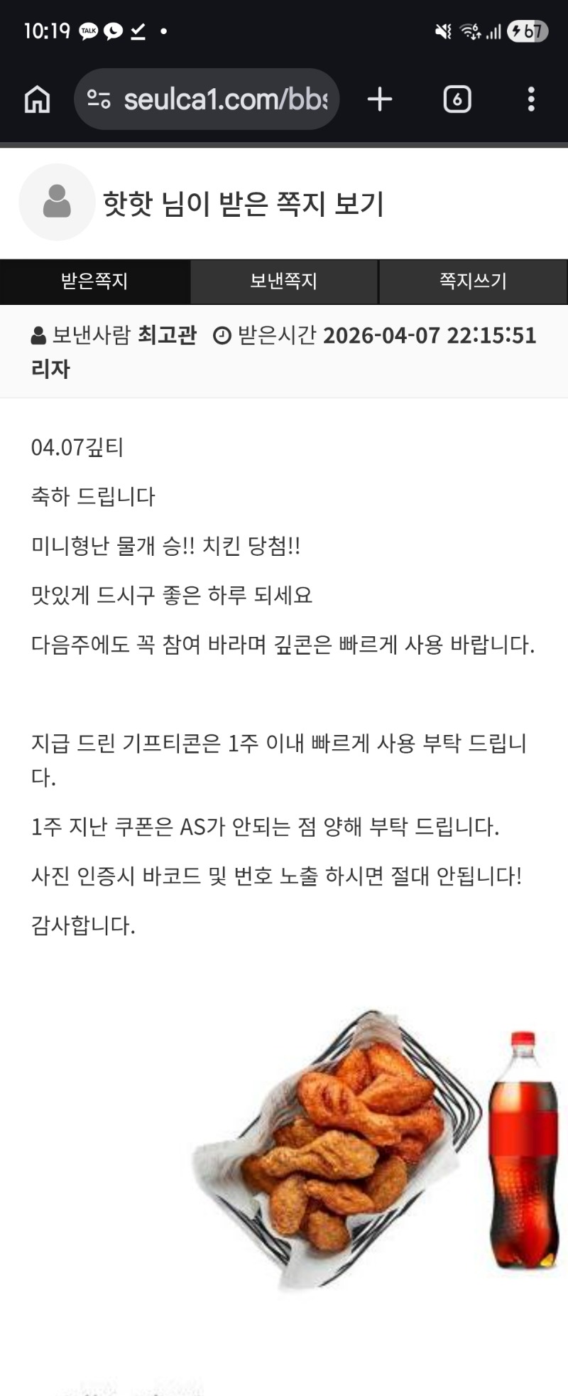 우악 미니형난 물개승 치킨깊티!!감사합니두~~ 핫핫 2 0 0 04.07 22:20 *기프티콘 바코드 노출 주의* <- 감사 0 0 https://seulca1.com/bbs/board.php?bo_table=free&wr_id=3765882 Author 0 0 Lv.6 핫핫 6 1,370,630 (37%) 핫핫님 보유 포인트 : P 1,835,246 +11 04.09 푸리보난자 161× +2 04.07 우악 미니형난 물개승 치킨깊티!!감사합니두~~ +28 04.06 더블퍼펙트페어!!! +30 04.06 토라매 329× +1 04.05 [비밀글] 배민쿠폰교환요