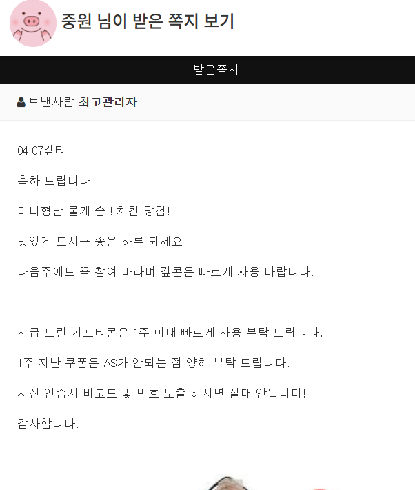 물개님 미형 승 치킨 감사합니다~ 중원 3 0 0 04.07 22:31 *기프티콘 바코드 노출 주의* <- 0 0 https://seulca1.com/bbs/board.php?bo_table=free&wr_id=3765910 Author 0 0 Lv.11 중원 11 11,041,644 (34%) 중원님 보유 포인트 : P 2,494,404 +17 04.08 멀린 9075배 +24 04.08 멀린 1070배 +30 04.08 멀린 1251배 +7 04.08 일복 1등 감사합니다 +3 04.07 물개님 미형 승 치킨 감사합니다~