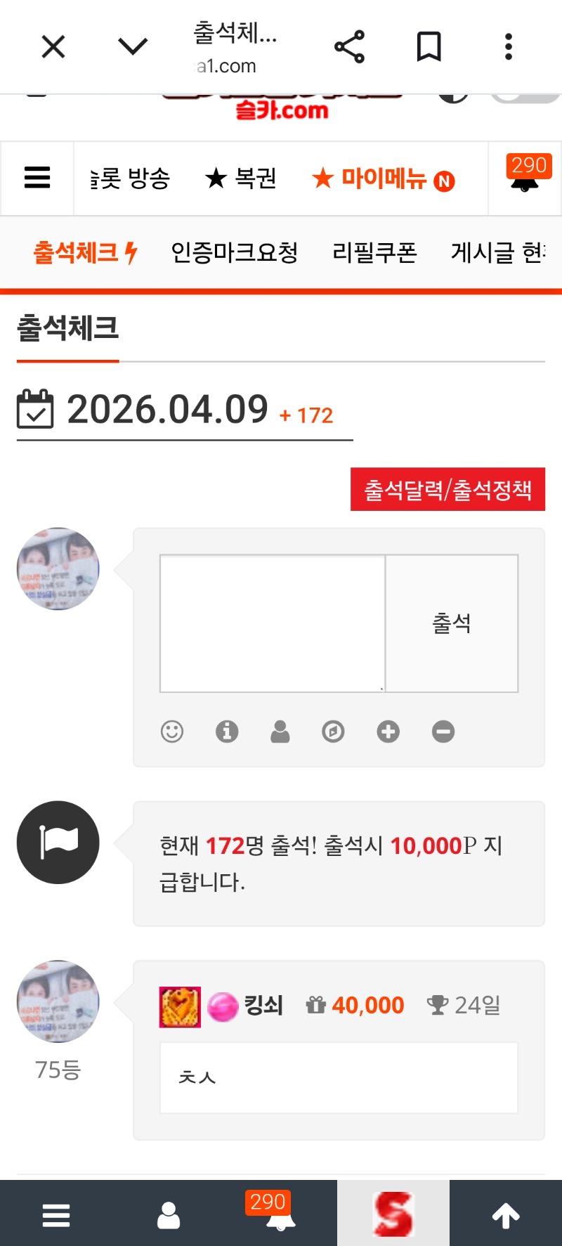 출석~~ 킹쇠 0 0 0 00:14:41 *기프티콘 바코드 노출 주의* <- 0 0 https://seulca1.com/bbs/board.php?bo_table=free&wr_id=3769216 Author 3 0 Lv.13 킹쇠 13 22,897,148 (97%) 킹쇠님 보유 포인트 : P 242,202 04.09 출석~~ 04.09 [비밀글] 배민쿠폰교환 +22 04.06 스보천 507 +9 04.06 스보천 226 +10 04.06 스보천 558