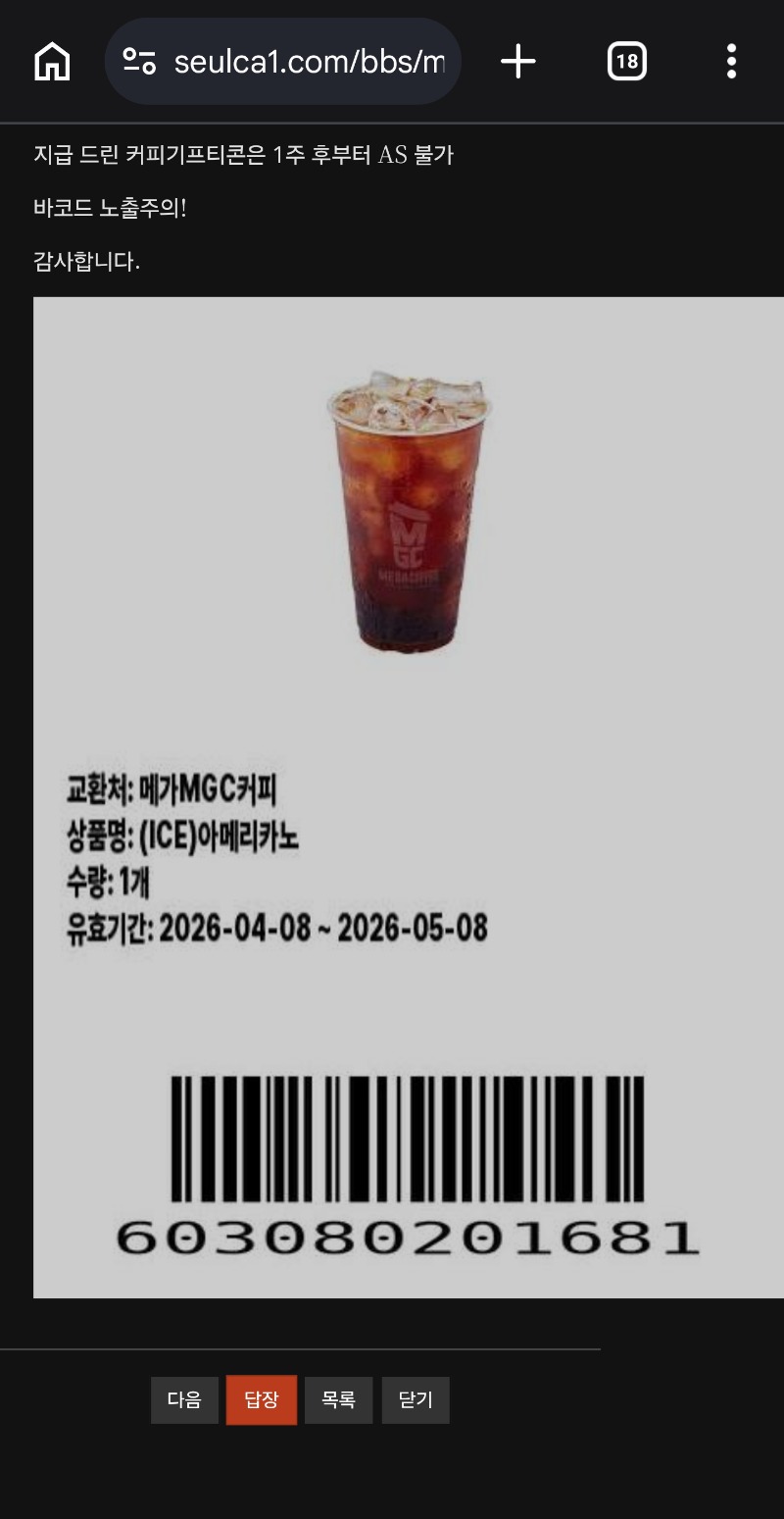 커피 고마워요 반포동쎅쎅이 0 0 0 05:06:17 *기프티콘 바코드 노출 주의* <- 0 0 https://seulca1.com/bbs/board.php?bo_table=free&wr_id=3769505 Author 0 0 Lv.9 반포동쎅쎅이 9 6,164,618 (54%) 반포동쎅쎅이님 보유 포인트 : P 7,288,637 04.09 상쾌한 아침~~~ +1 04.09 변사또...난 왜이리 별개다 좋냐??ㅋㅋ +1 04.09 출첰~~~ 04.09 커피 고마워요 04.08 이게 말이돼?