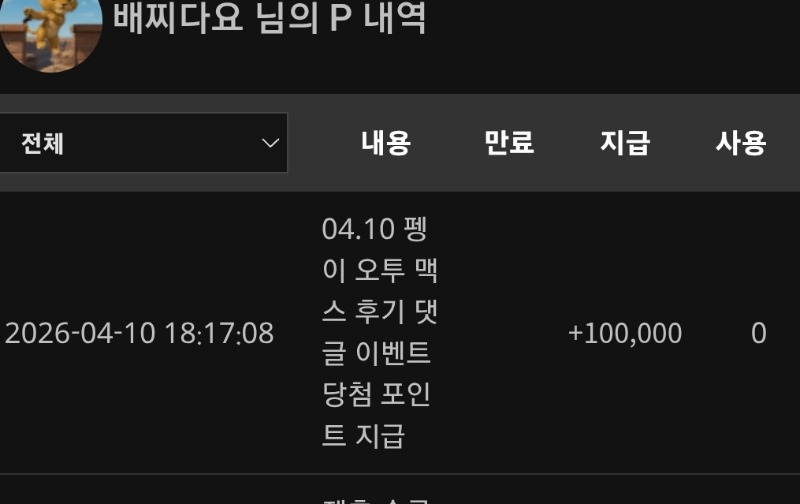 펭구르르릉♡수익포감사행! 배찌다요 5 0 0 04.10 18:23 *기프티콘 바코드 노출 주의* <- 오늘 펭이 수익봐서 이벤트도 해주고 고마웡 0 0 https://seulca1.com/bbs/board.php?bo_table=free&wr_id=3774940 Author 2 2 Lv.15 배찌다요 15 41,691,053 (58%) 배찌다요님 보유 포인트 : P 1,180,926 +10 04.11 비버추겜당첨 ❤️ 수익뽀 ❤️ +13 04.11 물개 추겜당첨 ❤️ 수익뽀나스 ❤️ +10 04.10 사자가 밥 사줬어영 (사자야 잘먹었엉♡) +17 04.10 사자 저메추로 시킨 수제비 +5 04.10 펭구르르릉♡수익포감사행!