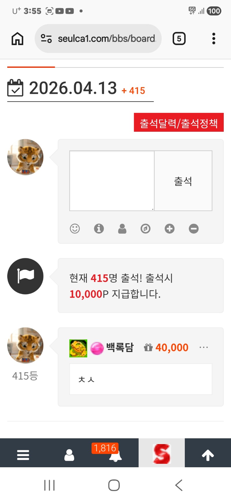 출석합니다 백록담 2 0 0 03:56:17 *기프티콘 바코드 노출 주의* <- 0 0 https://seulca1.com/bbs/board.php?bo_table=free&wr_id=3782079 Author 1 0 Lv.12 백록담 12 14,002,322 (20%) 백록담님 보유 포인트 : P 73,284 04.13 한번더 네츄럴 9승 04.13 네츄럴 9 승 04.13 뒷발안도와주네.. +2 04.13 출석합니다 +11 04.12 슬롯왕 룰렛당첨^^