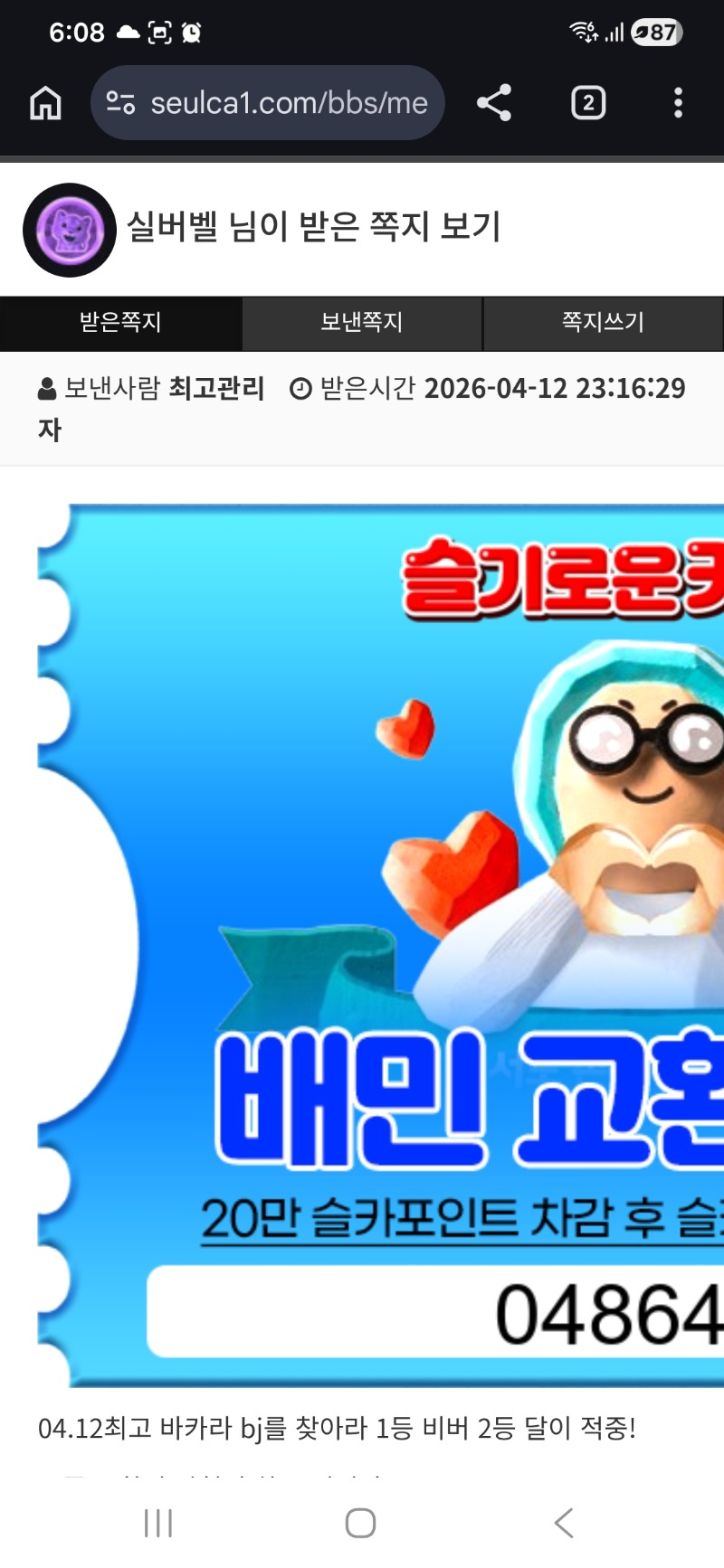 최바비1.2등 당첨~~ 실버벨 8 1 0 06:38:11 *기프티콘 바코드 노출 주의* <- 1 0 https://seulca1.com/bbs/board.php?bo_table=free&wr_id=3782277 Author 8 6 Lv.19 실버벨 19 171,636,798 (0%) 실버벨님 보유 포인트 : P 136,977 04.13 커피가 왔어요 ~~~ +8 04.13 최바비1.2등 당첨~~ +5 04.13 10등도 좋아요 ~~~~@@ +2 04.13 슬포 또 다털렸네 젠장~~~~ +6 04.13 월요일부터 주복이 왔어요