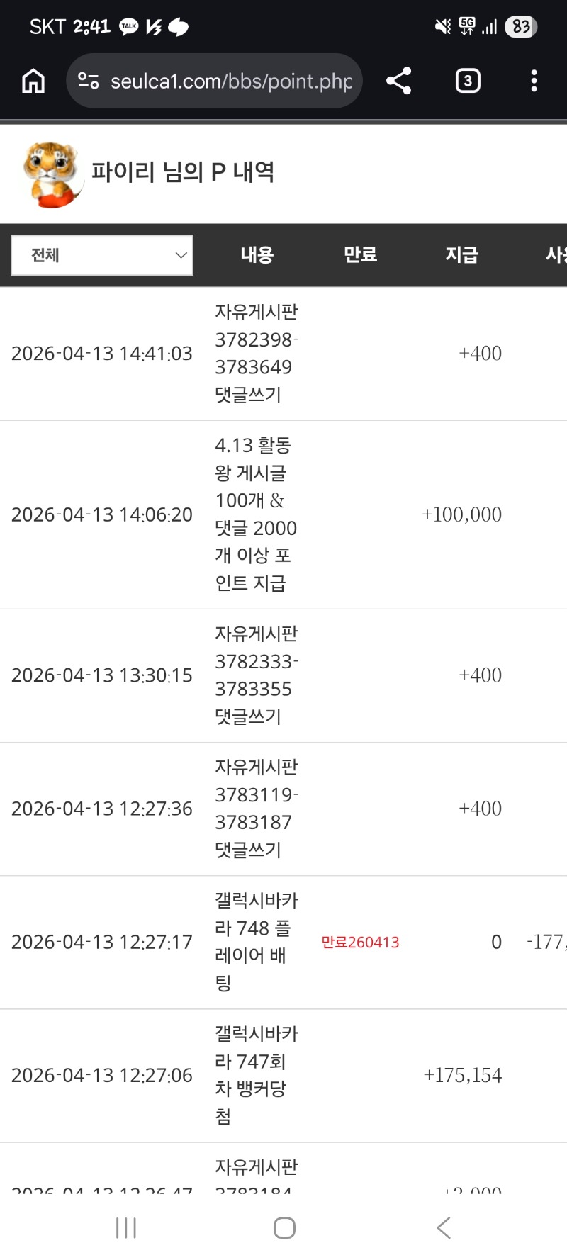 활동왕포 감사합니다 파이리 7 0 0 14:41:56 *기프티콘 바코드 노출 주의* <- 0 0 https://seulca1.com/bbs/board.php?bo_table=free&wr_id=3783652 Author 3 1 Lv.13 파이리 13 19,749,374 (34%) 파이리님 보유 포인트 : P 106,442 +7 04.13 활동왕포 감사합니다 +2 04.13 이모...ㅠㅠ +21 04.13 뱀피 2347배*200 +11 04.13 스톰 114배*3000 +16 04.13 스톰 392배*3000