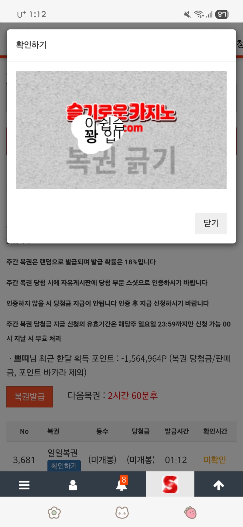 첫복권 꽝 쁘띠 1 0 0 01:12:52 *기프티콘 바코드 노출 주의* <- 0 0 https://seulca1.com/bbs/board.php?bo_table=free&wr_id=3785823 Author 17 4 Lv.17 쁘띠 17 80,879,642 (36%) 쁘띠님 보유 포인트 : P 610,141 +1 04.14 첫복권 꽝 04.14 출첵 +2 04.13 마지막 복권 꽝 +4 04.13 진짜 징글징글하네 +1 04.13 일복 꽝