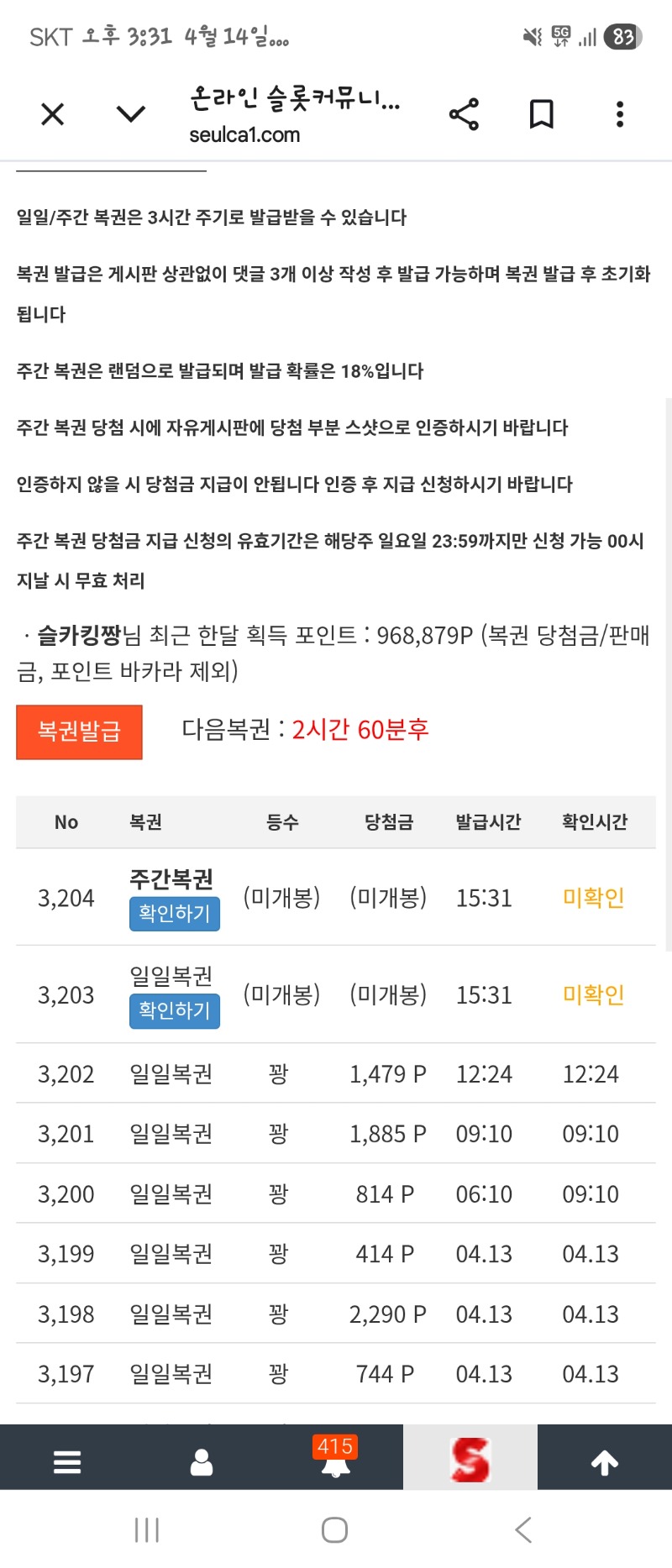 쌍복 오랜만이다~~~ 슬카킹짱 2 0 0 15:32:10 *기프티콘 바코드 노출 주의* <- 0 0 https://seulca1.com/bbs/board.php?bo_table=free&wr_id=3787712 Author 1 1 Lv.12 슬카킹짱 12 16,792,448 (75%) 슬카킹짱님 보유 포인트 : P 1,089,903 +2 04.14 쌍복 오랜만이다~~~ +1 04.14 좋은아침~~~ +34 04.14 버메가 357배 +1 04.13 퇴근해봅시다~~~ +13 04.13 멀린 바닥 맥매 287배