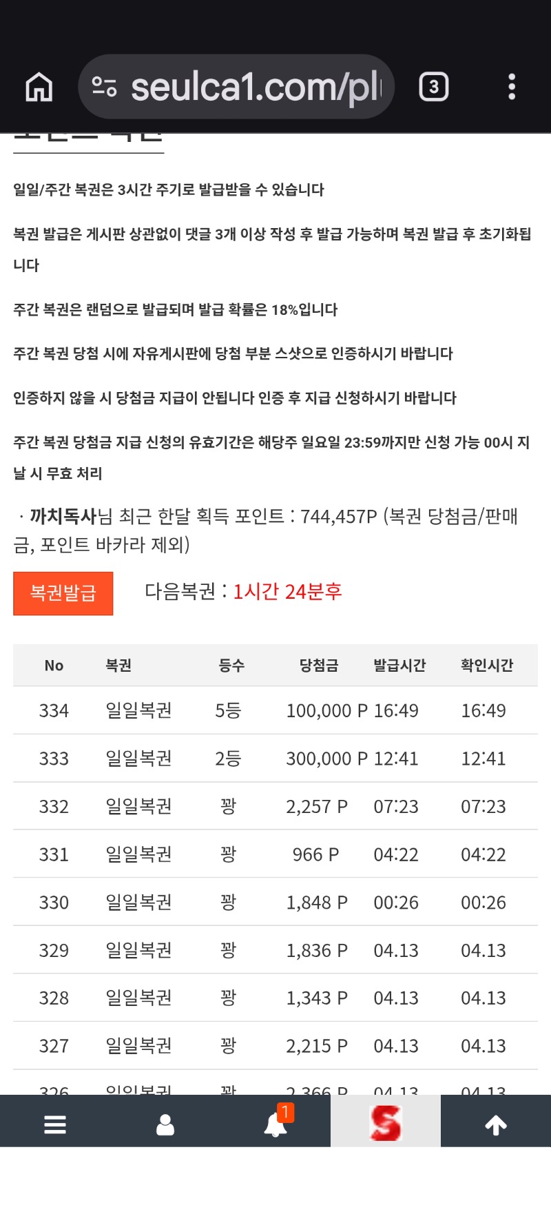 일복 연속 당첨 까치독사 3 0 0 18:27:20 *기프티콘 바코드 노출 주의* <- 고마워요 0 0 https://seulca1.com/bbs/board.php?bo_table=free&wr_id=3788398 Author 1 0 Lv.8 까치독사 8 3,391,632 (39%) 까치독사님 보유 포인트 : P 2,825,696 +3 04.14 한돈표 미형 럭포 지원금 당샷ㅅㅅㅅ +1 04.14 재은이랑 위아래로 럭포 당첨이 걸렸네 ㅋ +1 04.14 시안 이벤트인데 ㅠㅠ +12 04.14 펑크 토일렛 806배 +2 04.14 저녁에도 달리시나요??