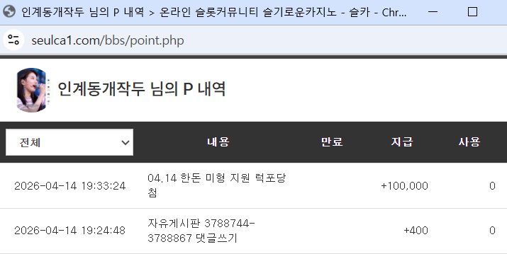 한돈이 럭포 당첨 샤샷 인계동개작두 4 0 0 20:07:04 *기프티콘 바코드 노출 주의* <- 깡치러 가즈아 쓰리깡 0 0 https://seulca1.com/bbs/board.php?bo_table=free&wr_id=3789029 Author 4 0 Lv.15 인계동개작두 15 35,241,375 (26%) 인계동개작두님 보유 포인트 : P 1,997 +4 04.14 한돈이 럭포 당첨 샤샷 +13 04.14 바카라 연패 또 네츄럴 패 8 대1 +13 04.14 바카라 패 9 대 0 +15 04.14 바카라 뱅 네츄럴 승 4 대 9 +3 04.14 비버 추겜당첨