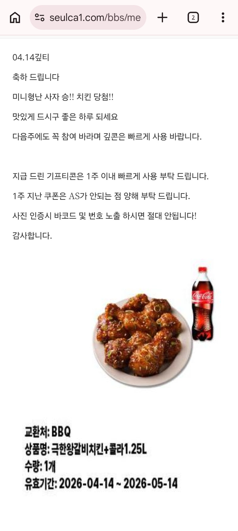 미니형난 치킨당첨♡ 메츄리 5 0 0 04.14 22:16 *기프티콘 바코드 노출 주의* < 아 진짜 슬카 남능거 있습니꺄 ㅋㄲㅋㅋㅋㄲ 넘조타 낼 저녁은 치킨이닭 0 0 https://seulca1.com/bbs/board.php?bo_table=free&wr_id=3789487 Author 1 0 Lv.6 메츄리 6 1,816,319 (81%) 메츄리님 보유 포인트 : P 63,016 04.15 출석 커피 감사함당!! 04.15 출석완료 +5 04.14 미니형난 치킨당첨♡ 04.14 포인트 빵원 무슨일이얌 +6 04.14 삼촌 리필용