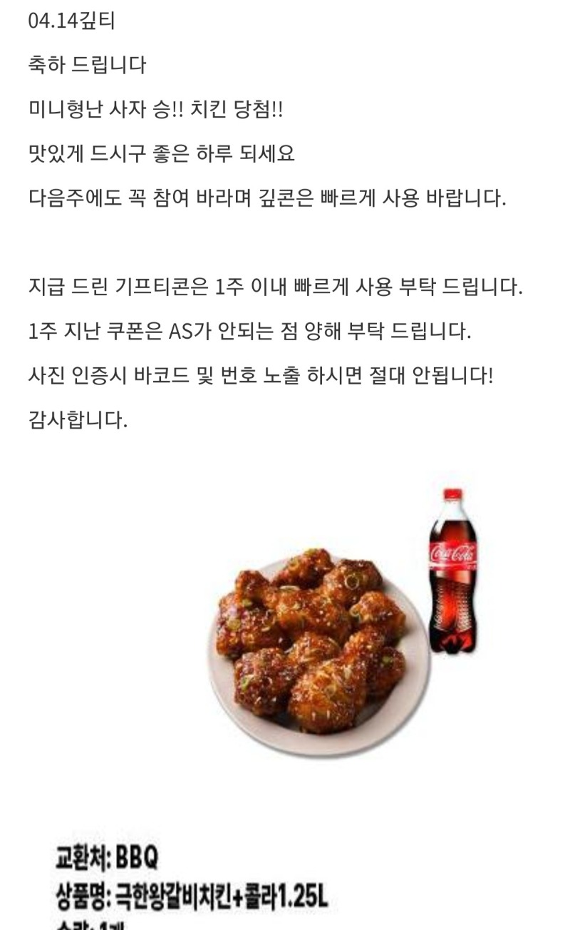 미형 치킨 당첨~ 세연 5 0 0 04.14 22:30 *기프티콘 바코드 노출 주의* <- 사자님 감사요! 내일 저녁은 치킨이닷!!! 0 0 https://seulca1.com/bbs/board.php?bo_table=free&wr_id=3789561 Author 2 0 Lv.12 세연 12 16,361,700 (67%) 세연님 보유 포인트 : P 24,759,241 +5 04.14 미형 치킨 당첨~ +5 04.11 야메추♡ +11 04.08 일복 1등 당첨! +1 04.06 달님 얼렁뚱땅 이벤포♡ +1 04.05 [비밀글] 배민교환