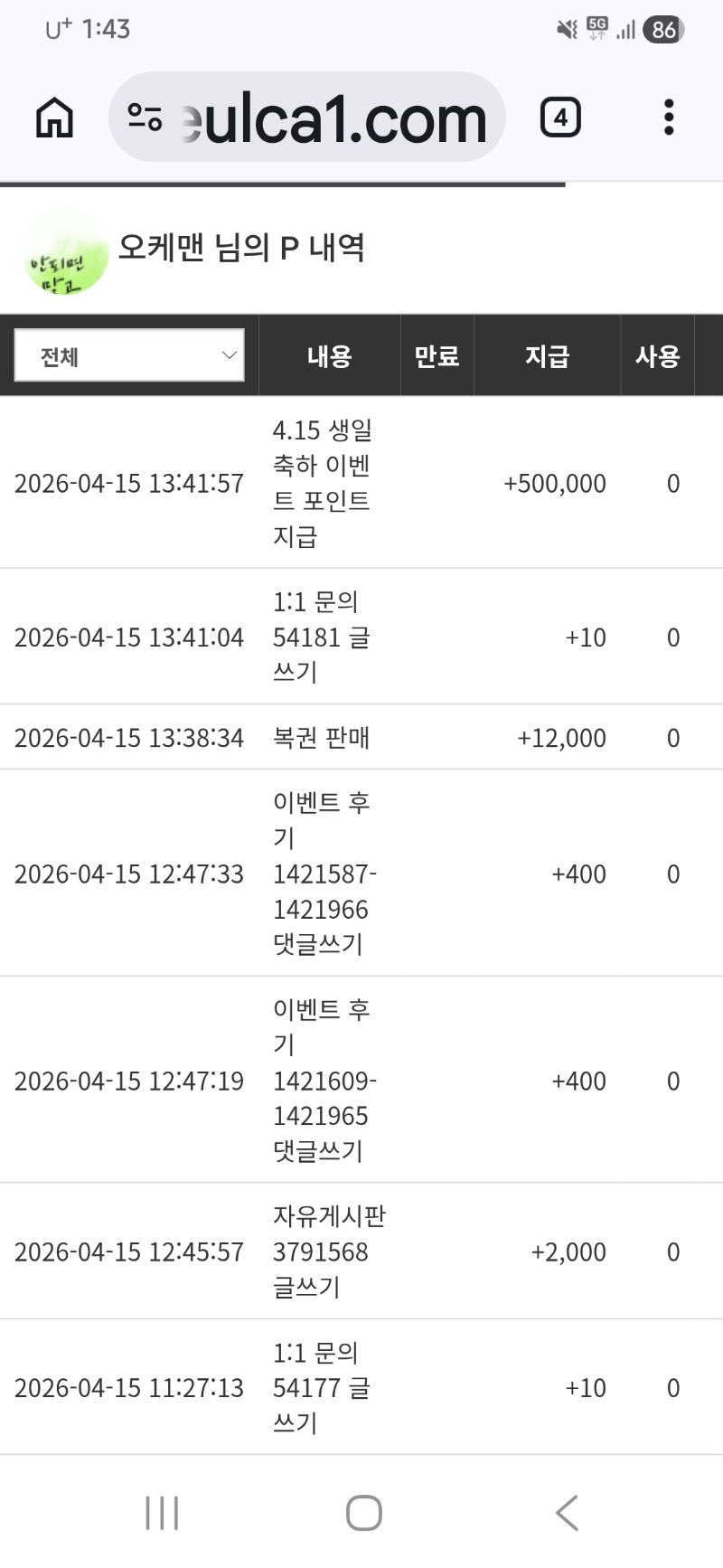 생일 축하 이벤트 포인트 감사합니다 오케맨 30 1 0 13:44:56 *기프티콘 바코드 노출 주의* <- 1 0 https://seulca1.com/bbs/board.php?bo_table=free&wr_id=3791748 Author 1 2 Lv.17 오케맨 17 73,962,890 (13%) 오케맨님 보유 포인트 : P 1,096,805 +30 04.15 생일 축하 이벤트 포인트 감사합니다 +3 04.15 맛있게 점심 드세요 +2 04.15 점심전에 커피 한잔 하시죠 +2 04.15 모닝 커피 한잔 하시죠 +2 04.15 늦은 출석 입니다