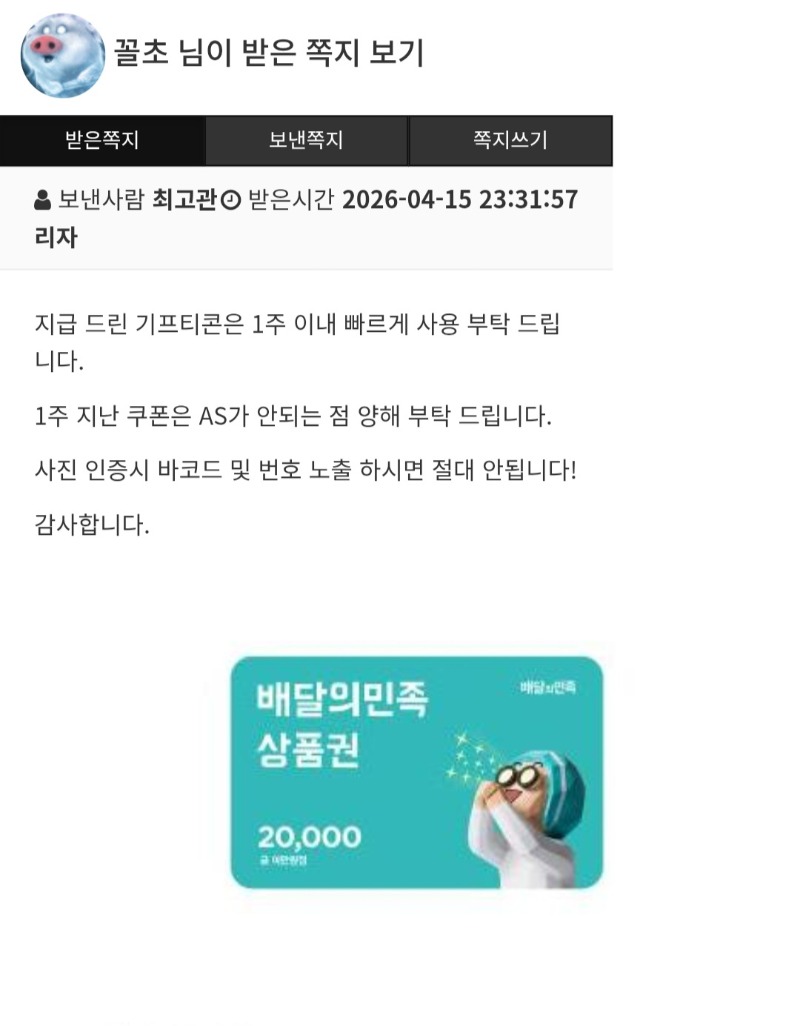 깜짝선물? 꼴초 5 0 0 04.15 23:44 *기프티콘 바코드 노출 주의* <- 내가 젤좋아하는 돈이형이겟죠?ㅎㅎ 돈이형 맛난거 먹을께용 방송하는라 고생햇어요~~틈틈이 시간맹글어서 보러갈께요^^ 0 0 https://seulca1.com/bbs/board.php?bo_table=free&wr_id=3794260 Author 1 0 Lv.13 꼴초 13 21,526,270 (70%) 꼴초님 보유 포인트 : P 1,667,916 +5 04.15 깜짝선물? +6 04.15 최배비 돈이형 1등 ㅅㅅ +2 04.15 일복꽝 +5 04.15 굿모닝입니다~~ +3 04.15 커피잘마실게요~~^^