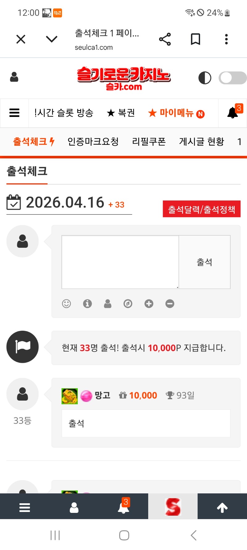 출석합니다 망고 0 0 0 00:01:24 *기프티콘 바코드 노출 주의* <- 3땡 0 0 https://seulca1.com/bbs/board.php?bo_table=free&wr_id=3794306 Author 2 0 Lv.12 망고 12 16,517,368 (70%) 망고님 보유 포인트 : P 2,538,339 04.16 출석합니다 +9 04.15 호넷돌발후기 +18 04.15 익스트림24배 +9 04.15 일복6등 +4 04.15 시안데이후기