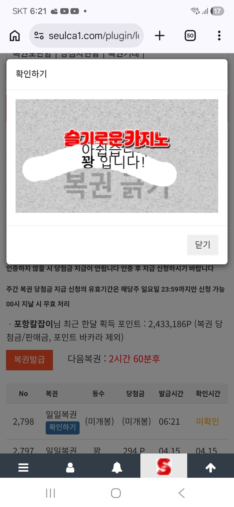 모닝꽝. ㅋ 포항칼잡이 2 0 0 06:22:10 *기프티콘 바코드 노출 주의* <- 0 0 https://seulca1.com/bbs/board.php?bo_table=free&wr_id=3794784 Author 3 1 Lv.12 포항칼잡이 12 16,176,273 (63%) 포항칼잡이님 보유 포인트 : P 2,543,502 +2 04.16 모닝꽝. ㅋ +24 04.15 뱀피 1508배. 숙제 +28 04.15 좀스2342배 +14 04.15 오라메 267배 +7 04.15 주복9등 이거땜시 숙제 해야하네 ㅋ