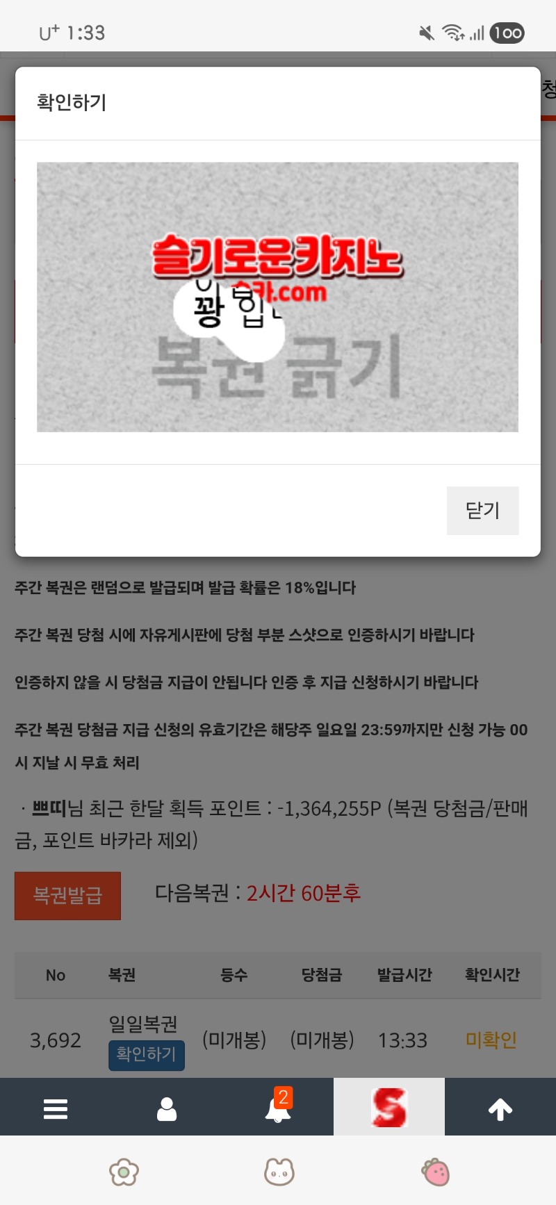 점심 복권 꽝 쁘띠 2 0 0 13:34:09 *기프티콘 바코드 노출 주의* <- 0 0 https://seulca1.com/bbs/board.php?bo_table=free&wr_id=3796455 Author 17 4 Lv.17 쁘띠 17 81,002,599 (36%) 쁘띠님 보유 포인트 : P 1,136,850 +2 04.16 점심 복권 꽝 +4 04.16 아침 복권 꽝 +2 04.16 첫복권 꽝 +2 04.16 출첵 +2 04.15 저녁 복권 꽝