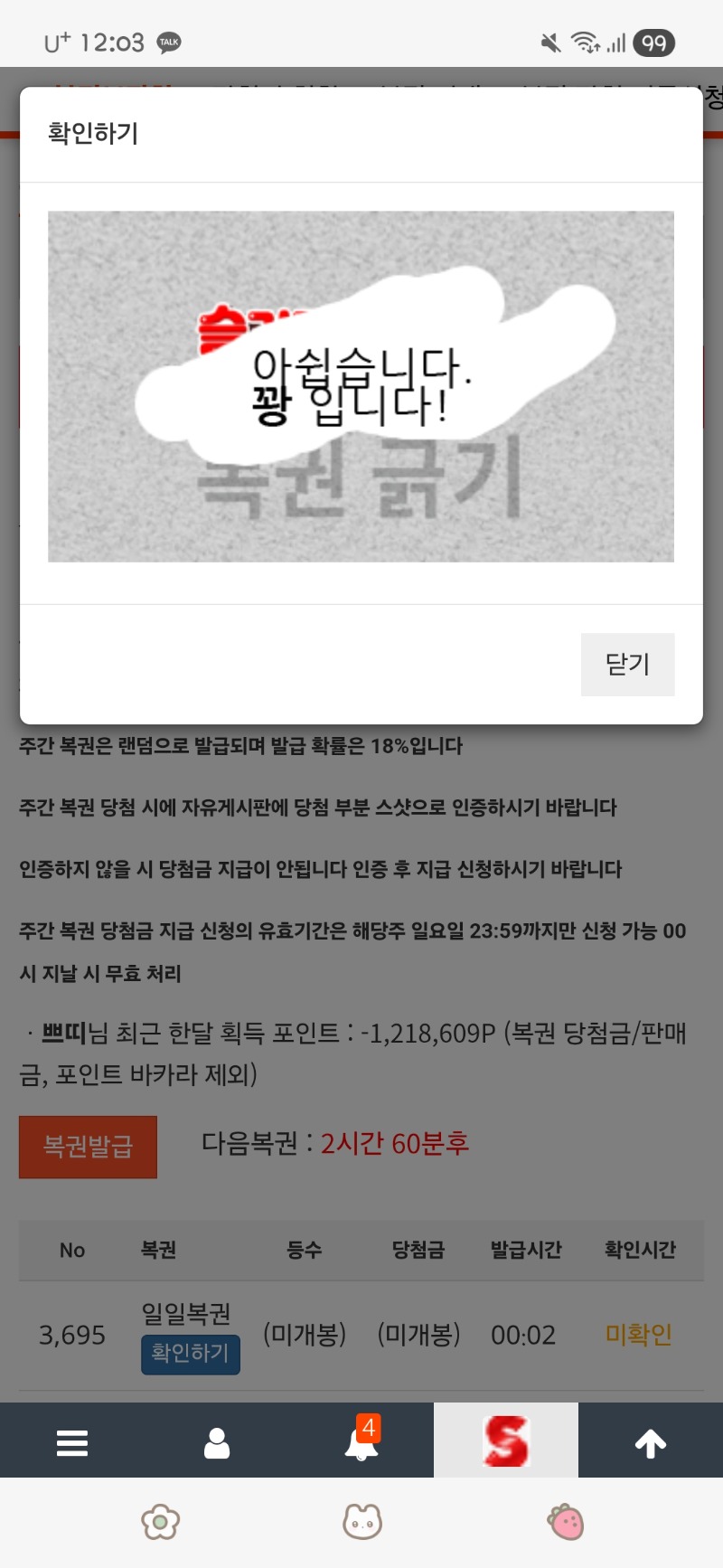 첫복권 꽝 쁘띠 1 0 0 00:03:32 *기프티콘 바코드 노출 주의* <- 0 0 https://seulca1.com/bbs/board.php?bo_table=free&wr_id=3799190 Author 17 4 Lv.17 쁘띠 17 81,068,003 (36%) 쁘띠님 보유 포인트 : P 1,304,514 04.17 출첵 포인트 +1 04.17 첫복권 꽝 04.17 출첵 +3 04.16 저녁 복권 꽝 +3 04.16 사자~~럭포 포인트 ~