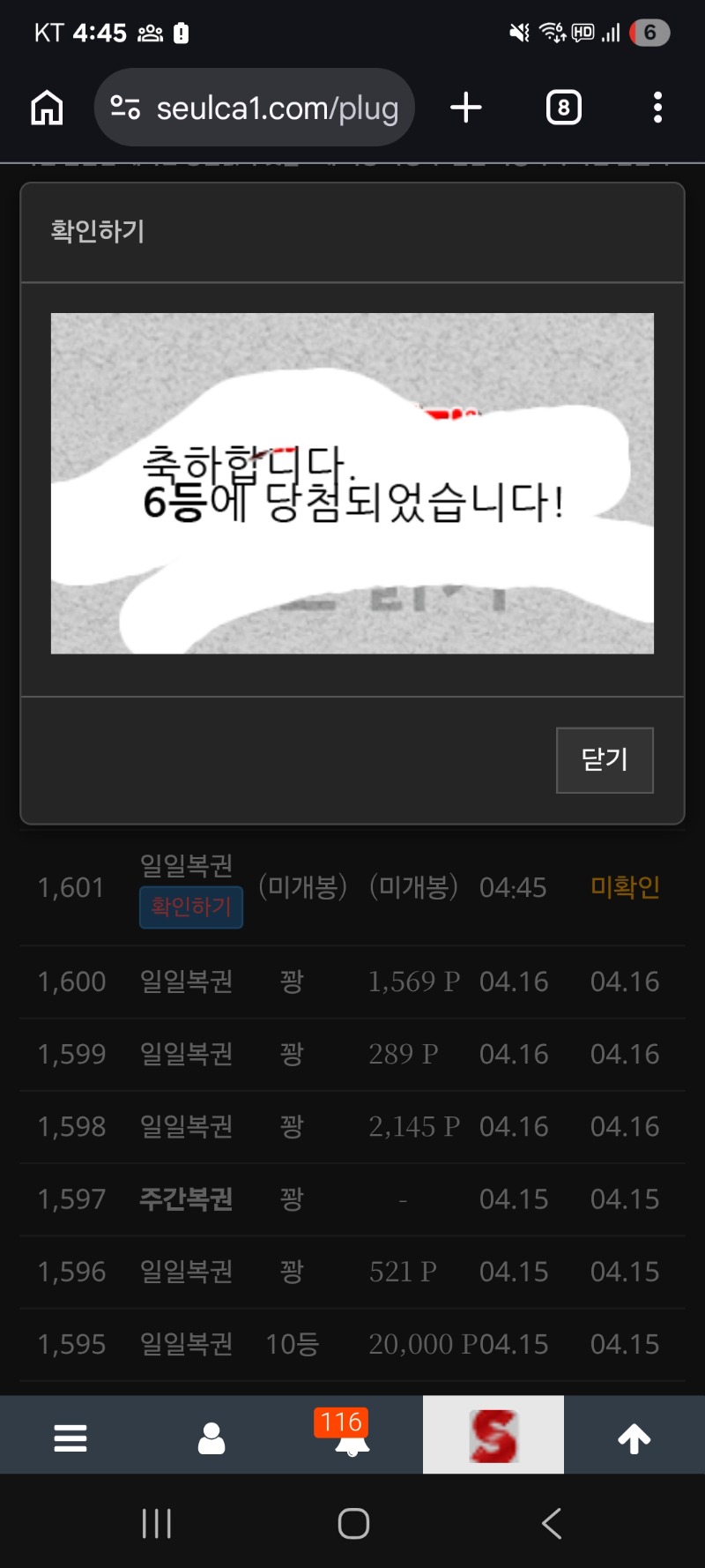 일복6등 당첨 바꿔볼까 6 0 0 04:46:09 *기프티콘 바코드 노출 주의* <- 0 0 https://seulca1.com/bbs/board.php?bo_table=free&wr_id=3799592 Author 0 0 Lv.11 바꿔볼까 11 10,698,405 (23%) 바꿔볼까님 보유 포인트 : P 122,907 +6 04.17 일복6등 당첨 +2 04.16 캬 레부 100퍼가 눈에 아른거리네 +7 04.15 예쓰기릿10등이부연 +5 04.13 일복 10등 +9 04.13 일복5등 2연타 좋구요