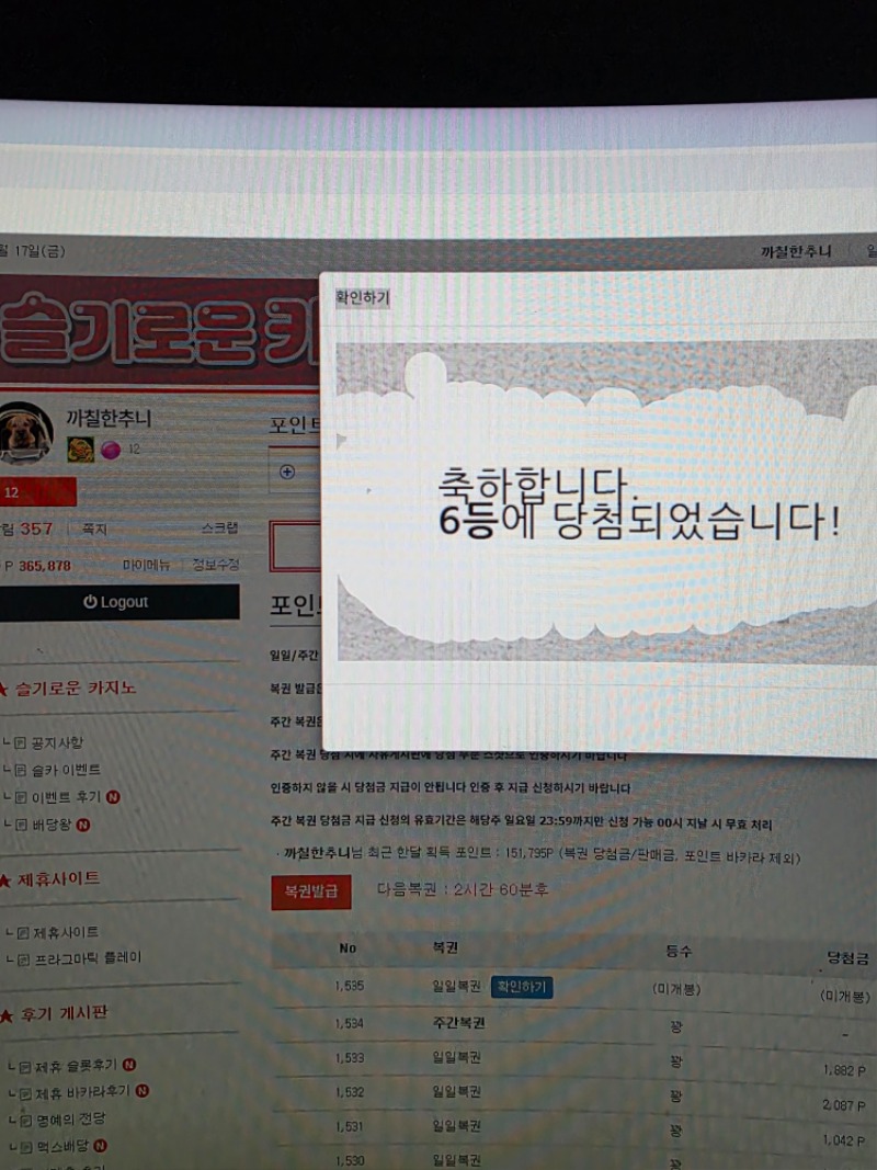 오늘하루 일복 6등 8등당첨 까칠한추니 7 0 0 20:47:06 *기프티콘 바코드 노출 주의* <- 0 0 https://seulca1.com/bbs/board.php?bo_table=free&wr_id=3802478 Author 1 0 Lv.12 까칠한추니 12 14,773,024 (35%) 까칠한추니님 보유 포인트 : P 21,509 +1 04.17 [비밀글] 포인트 교환신청 +7 04.17 오늘하루 일복 6등 8등당첨 +1 04.17 출석요 +2 04.16 맛점하세요 +1 04.16 출석요