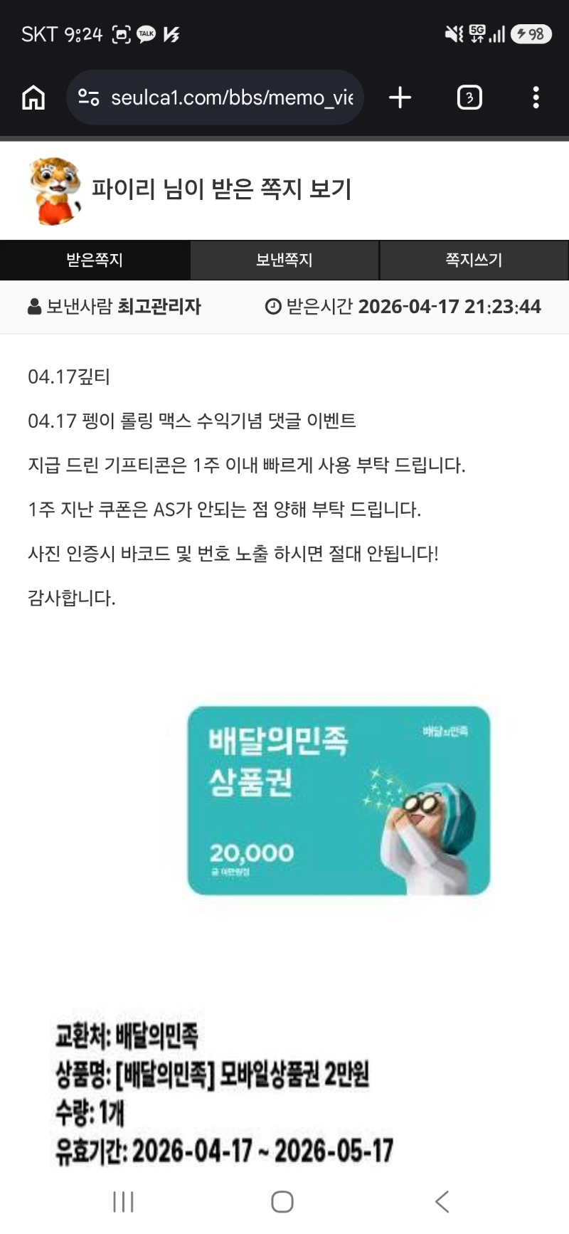 펭이 롤링맥스 배민쿱 파이리 4 0 0 21:29:24 *기프티콘 바코드 노출 주의* <- 0 0 https://seulca1.com/bbs/board.php?bo_table=free&wr_id=3802634 Author 3 1 Lv.13 파이리 13 20,180,933 (43%) 파이리님 보유 포인트 : P 0 +4 04.17 펭이 롤링맥스 배민쿱 +3 04.17 사자추겜 포! +12 04.17 갑자기일복4등 ㄷㄷ +20 04.17 이번주 롤링만... +16 04.17 슬롯도개망 ㅠㅠ