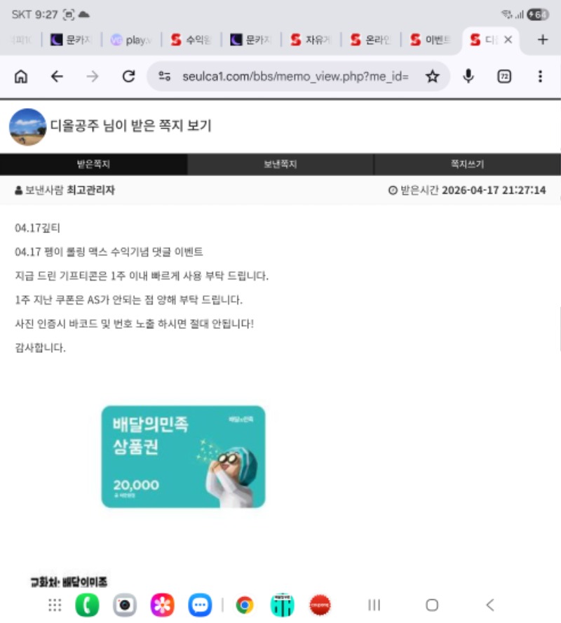 펭님 수익기념댓글 배민쿠폰 ㅅㅅ 디올공주 6 0 0 21:29:30 *기프티콘 바코드 노출 주의* <- 0 0 https://seulca1.com/bbs/board.php?bo_table=free&wr_id=3802635 Author 27 16 Lv.19 디올공주 19 222,453,981 (0%) 디올공주님 보유 포인트 : P 10,800 +3 04.17 쌍복이네 +6 04.17 펭님 수익기념댓글 배민쿠폰 ㅅㅅ +5 04.17 리필요 +1 04.17 [비밀글] 포교신청 +13 04.17 수익왕 5등으로~