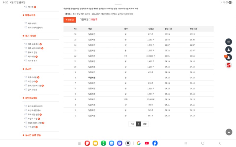 일복4등 퐁네프 8 1 0 21:32:09 *기프티콘 바코드 노출 주의* <- 1 0 https://seulca1.com/bbs/board.php?bo_table=free&wr_id=3802653 Author 0 0 Lv.4 퐁네프 4 277,428 (59%) 퐁네프님 보유 포인트 : P 699,228 +8 04.17 일복4등 +4 04.17 굿밤 04.17 배당 +1 04.17 [비밀글] 400000포인트교환 +3 04.17 맛저하세요