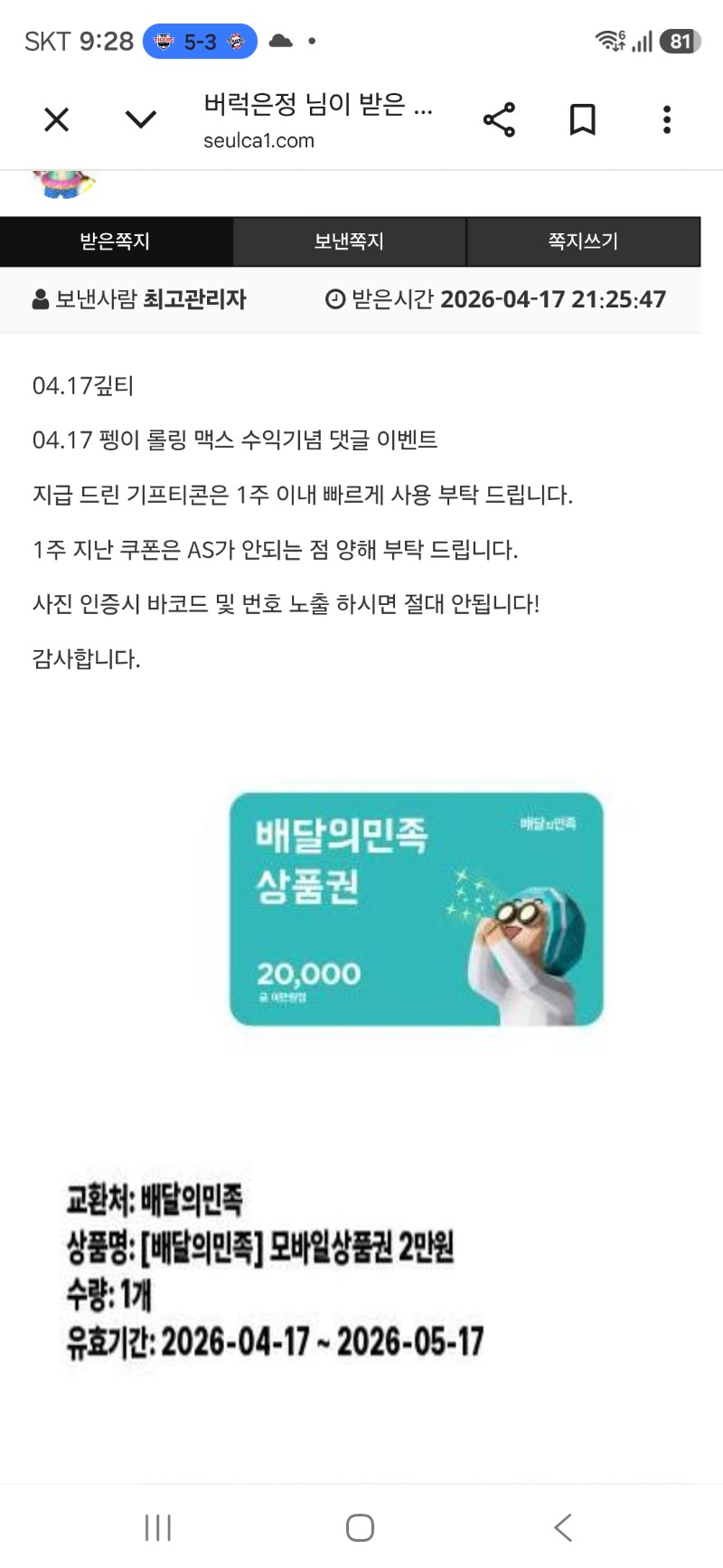 펭이 맥스 이벤트 당춈 버럭은정 5 0 0 21:32:28 *기프티콘 바코드 노출 주의* <- 0 0 https://seulca1.com/bbs/board.php?bo_table=free&wr_id=3802656 Author 1 0 Lv.9 버럭은정 9 6,557,687 (63%) 버럭은정님 보유 포인트 : P 39,901,013 +5 04.17 펭이 맥스 이벤트 당춈 +4 04.17 펭그리 추겜 +3 04.17 펭그리 추겜당춈 +10 04.15 울지니언니 생일축하해 ~~ +1 04.14 사자.비버 고생했어