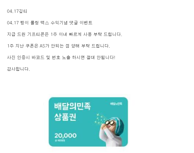 펭이 수익 댓글 이벤트 배민~~ 매드맥스 5 1 0 21:44:03 *기프티콘 바코드 노출 주의* <- 펭아~ 오늘 수익 좋았다잉~~ 배민 잘 먹을게!! 축하햄!!^^ 1 0 https://seulca1.com/bbs/board.php?bo_table=free&wr_id=3802741 Author 6 3 Lv.14 매드맥스 14 24,087,722 (15%) 매드맥스님 보유 포인트 : P 22,057 +5 04.17 펭이 수익 댓글 이벤트 배민~~ +5 04.17 이번주 슬카라 승률 +10 04.16 랑이 오2 추겜당첨!! 3억3쵼!! 나이슈!! +7 04.16 퐁아 배찌야암~~ +17 04.16 딸기1키로~ 오늘 장본것들~