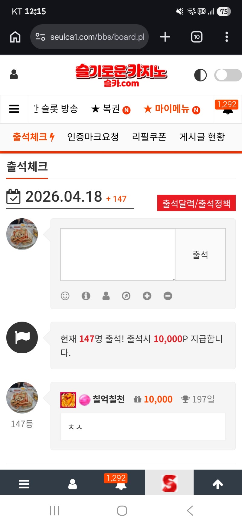 출석인증 칠억칠천 1 0 0 00:15:56 *기프티콘 바코드 노출 주의* <- 0 0 https://seulca1.com/bbs/board.php?bo_table=free&wr_id=3803400 Author 9 2 Lv.13 칠억칠천 13 19,504,707 (30%) 칠억칠천님 보유 포인트 : P 15,400 +1 04.18 출석인증 +11 04.17 빠른저녁후 빠른 후식 야식준비는 덤 +5 04.17 펭이 추겜 슬포 감사합니다 +6 04.17 이른저녁! +4 04.17 퇴근길 간만에 종이프로토 사보려 합니다.