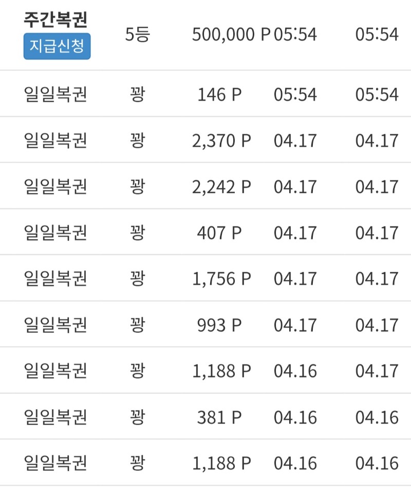 모닝주복이!!! 5등 당첨!나이스! 코모 8 1 0 05:59:05 *기프티콘 바코드 노출 주의* <- 1 0 https://seulca1.com/bbs/board.php?bo_table=free&wr_id=3803839 Author 0 0 Lv.9 코모 9 5,402,207 (35%) 코모님 보유 포인트 : P 73,547 +8 04.18 모닝주복이!!! 5등 당첨!나이스! 04.18 [비밀글] 주간복권5등 당첨 신청합니다 +1 04.18 출석체크! +2 04.17 이모ㅜㅜ또 찾게되네요ㅜㅜ +10 04.17 로얄슈슈 128배