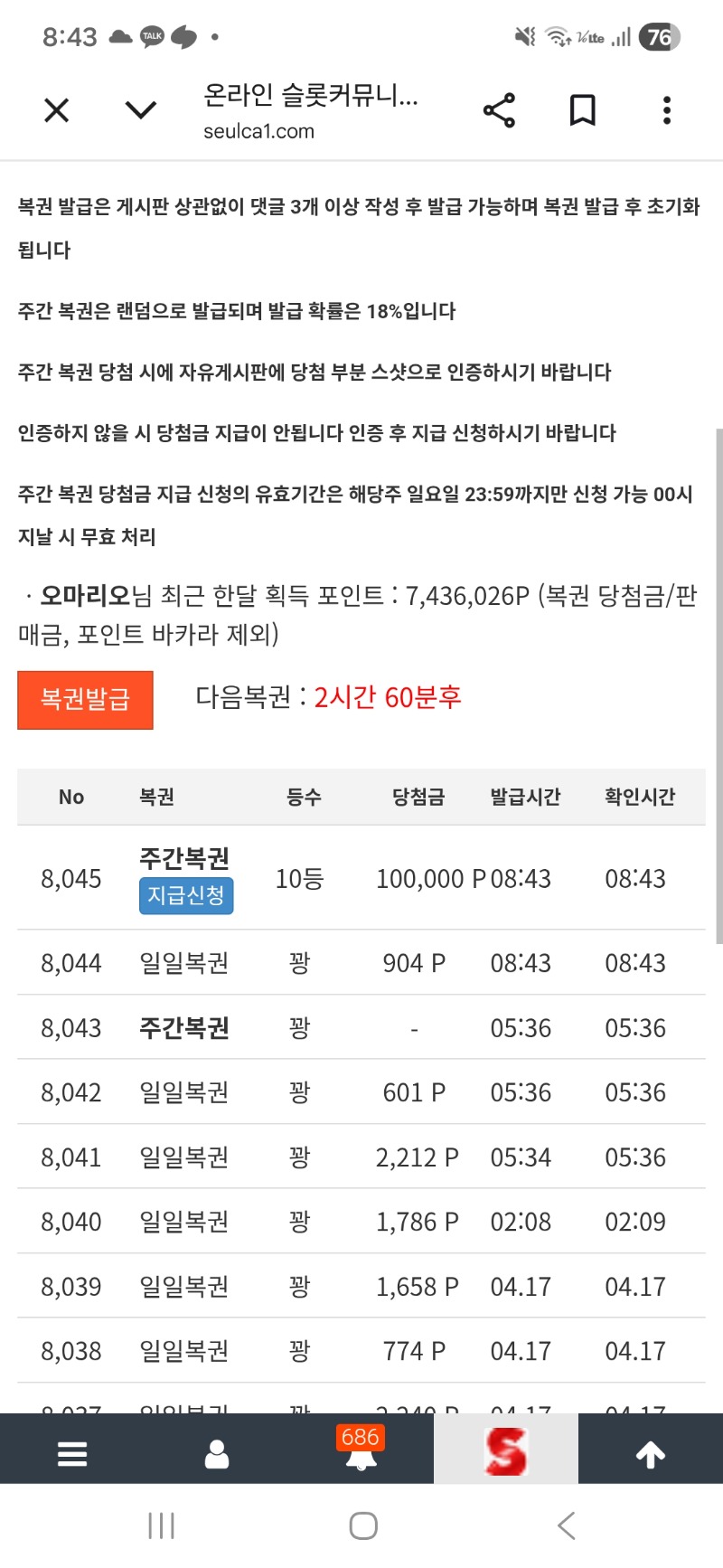 주복10등~~ 오마리오 8 0 0 08:44:02 *기프티콘 바코드 노출 주의* <- 감사합니다 0 0 https://seulca1.com/bbs/board.php?bo_table=free&wr_id=3804245 Author 5 0 Lv.16 오마리오 16 64,789,771 (73%) 오마리오님 보유 포인트 : P 10 04.18 [비밀글] 주복10등 +8 04.18 주복10등~~ +5 04.17 양 추천게임 당첨 성공~~~ +11 04.16 닭집 141배 +12 04.16 오라메 207배