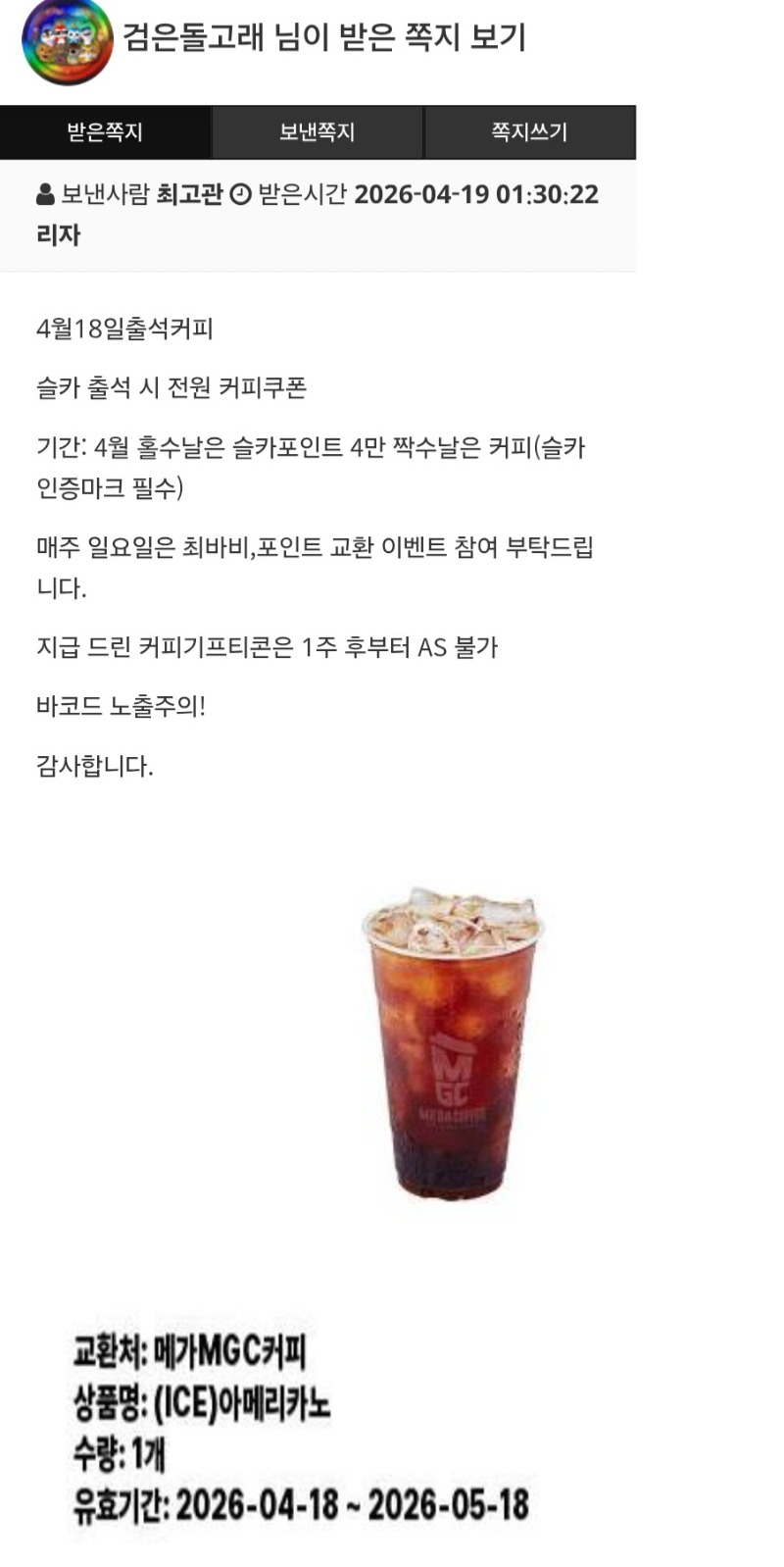 출첵 커피도착^^ 검은돌고래 1 0 0 04:17:16 *기프티콘 바코드 노출 주의* <- 커피 감사합니다 ^^ 0 0 https://seulca1.com/bbs/board.php?bo_table=free&wr_id=3808357 Author 9 5 Lv.19 검은돌고래 19 166,114,723 (0%) 검은돌고래님 보유 포인트 : P 3,261,852 +1 04.19 출첵 커피도착^^ 04.19 출첵합시다 ^^ 04.18 로또되고싶다!!ㅎ +24 04.18 블랙잭 연승ㅅㅅㅅ +19 04.18 블랙잭 다시 승으로 ㅅㅅ
