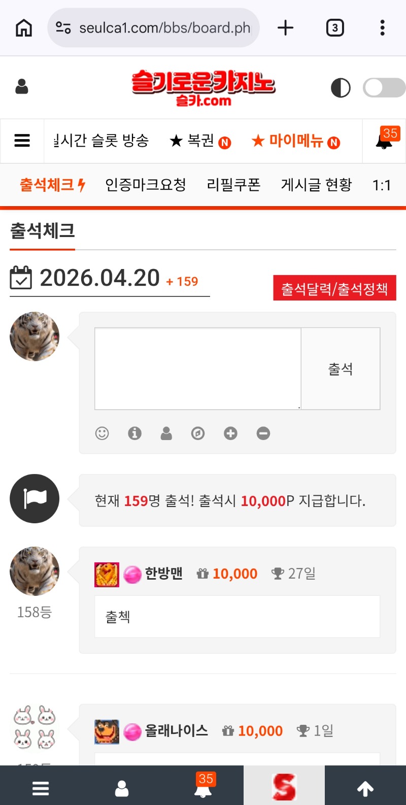 출첵 한방맨 0 0 0 00:10:51 *기프티콘 바코드 노출 주의* <- 0 0 https://seulca1.com/bbs/board.php?bo_table=free&wr_id=3812755 Author 2 0 Lv.13 한방맨 13 20,187,444 (43%) 한방맨님 보유 포인트 : P 6,600 +7 04.20 파포478배 +20 04.20 파포980배 04.20 출첵 +1 04.19 [비밀글] 포인트 교환 신청 +2 04.19 연타주복이네 1.2.3등 다나오니주네 ㅎㅎ