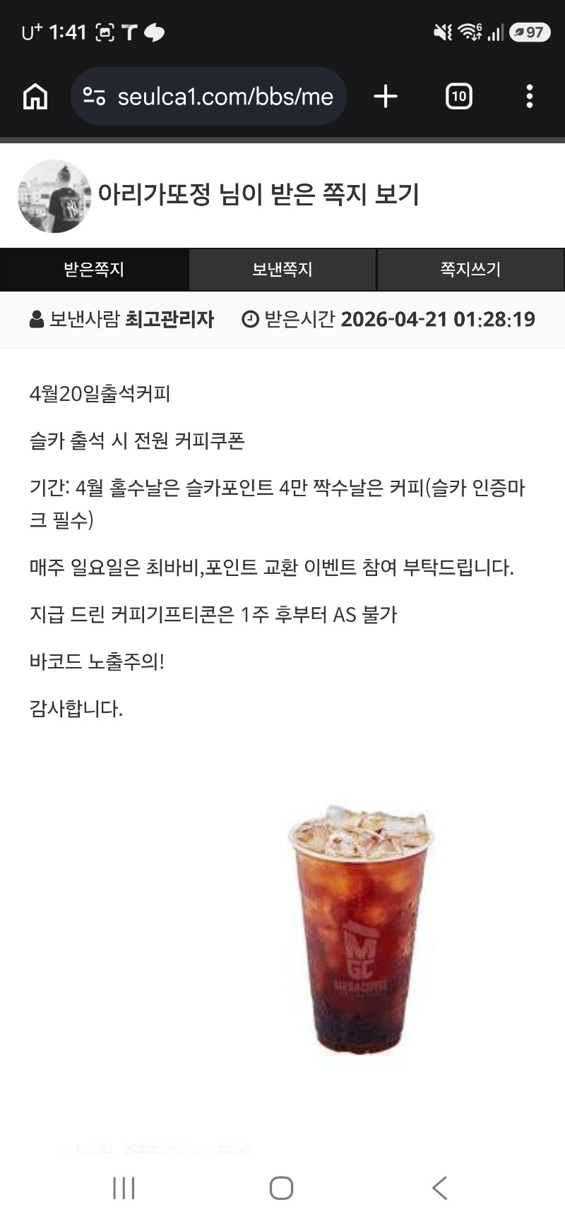 커피감사합니다 아리가또정 0 0 0 01:41:29 *기프티콘 바코드 노출 주의* <- 0 0 https://seulca1.com/bbs/board.php?bo_table=free&wr_id=3817116 Author 5 2 Lv.13 아리가또정 13 18,568,934 (11%) 아리가또정님 보유 포인트 : P 13,060,634 04.21 출석 +3 04.21 토라메740 +5 04.21 토라메878 +3 04.21 토랑세720 +2 04.21 토라메405