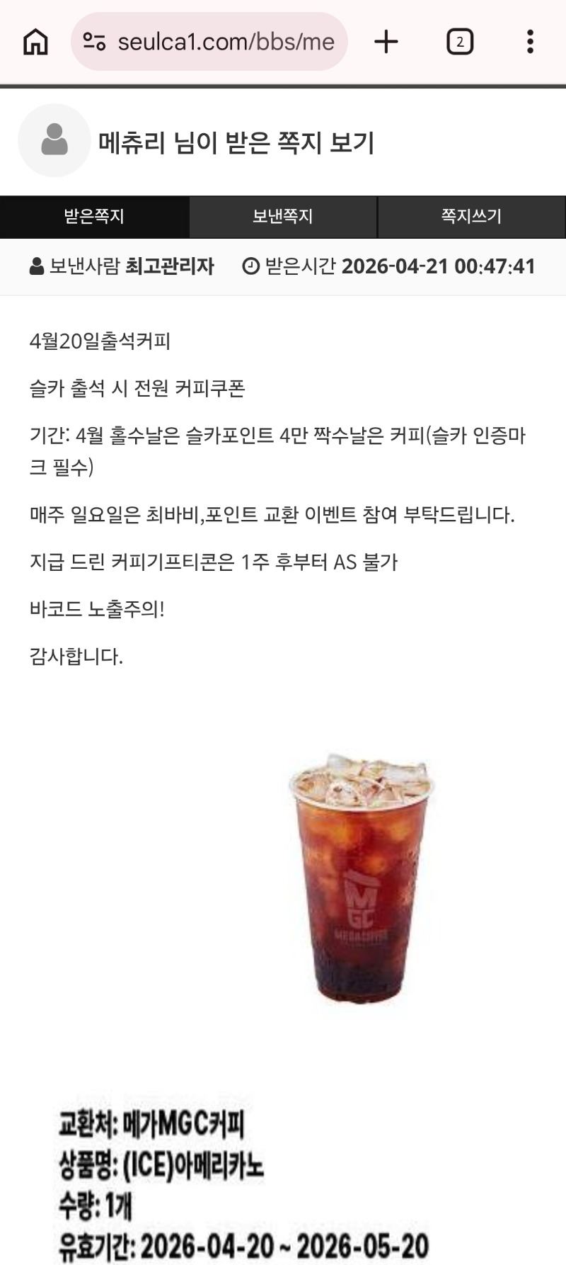 출석커피 감사합니다 ♡ 메츄리 2 1 0 02:23:51 *기프티콘 바코드 노출 주의* <- 1 0 https://seulca1.com/bbs/board.php?bo_table=free&wr_id=3817177 Author 1 0 Lv.7 메츄리 7 2,856,562 (85%) 메츄리님 보유 포인트 : P 718,560 04.21 대 패ㅠㅠㅜ 04.21 소액 패 04.21 타이못먹엇네ㅠㅠ +2 04.21 출석커피 감사합니다 ♡ +2 04.21 ㅊㅅ