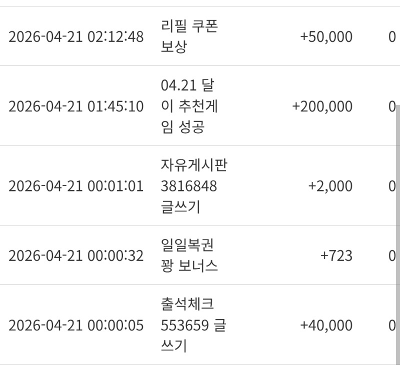 달이 추겜슬포 감사합니다 수익은 담에보자잇 칠억칠천 3 1 0 02:25:14 *기프티콘 바코드 노출 주의* <- 1 0 https://seulca1.com/bbs/board.php?bo_table=free&wr_id=3817185 Author 9 2 Lv.13 칠억칠천 13 19,777,872 (35%) 칠억칠천님 보유 포인트 : P 705,909 +3 04.21 달이 추겜슬포 감사합니다 수익은 담에보자잇 +1 04.21 출석 인증 +2 04.20 토끼 사자 추겜 성공 +1 04.20 출석ㅇㅈ 너무 일찍 눈이 떠졌다! +4 04.19 날아간 내포교여 안녕