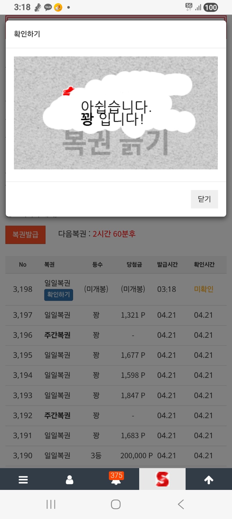모닝복권 북쟁이리 0 0 0 03:19:19 *기프티콘 바코드 노출 주의* <- 꽝. 0 0 https://seulca1.com/bbs/board.php?bo_table=free&wr_id=3820784 Author 4 3 Lv.15 북쟁이리 15 31,597,117 (7%) 북쟁이리님 보유 포인트 : P 0 04.22 출첵 04.22 모닝복권 04.21 시안 미니형난 이벤트 참여 완료 +2 04.21 맛저하세요 +23 04.21 멀린 950배
