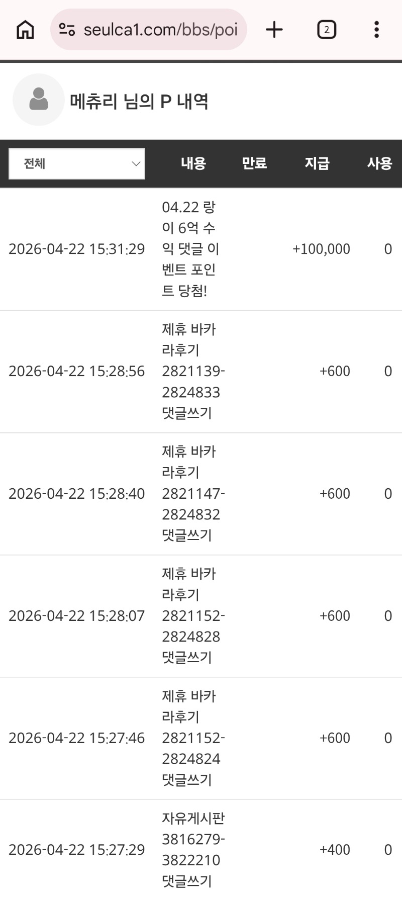랑이 수익포 감사감사♡ 메츄리 4 0 0 15:41:34 *기프티콘 바코드 노출 주의* <- 0 0 https://seulca1.com/bbs/board.php?bo_table=free&wr_id=3822257 Author 1 0 Lv.8 메츄리 8 3,053,620 (5%) 메츄리님 보유 포인트 : P 1,792,317 04.22 모두 맛저하세용~~ㅎㅎ +4 04.22 랑이 수익포 감사감사♡ +2 04.22 연타쌍복 ㅋㅋㅋㅋㅋ줄때주는걸까????? +10 04.22 레벨업 ㅅㅅ 맛점하십시용 ~~♡ +18 04.22 인나자마자 일복3등 ㅅㅅ 감쟈합니다