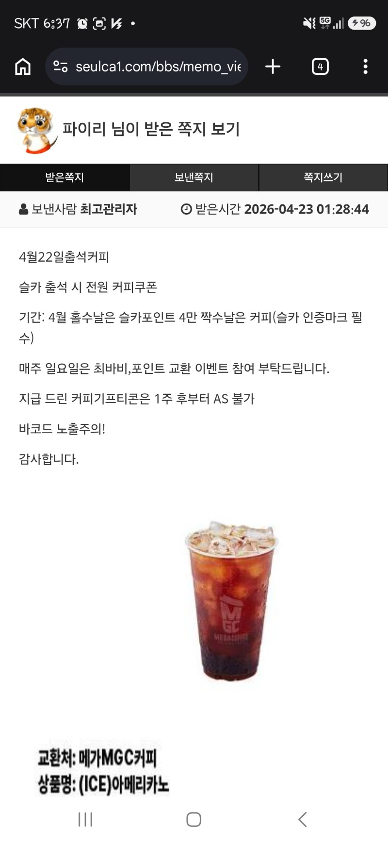 출첵커피 감사합니다 파이리 1 0 0 06:38:27 *기프티콘 바코드 노출 주의* <- 0 0 https://seulca1.com/bbs/board.php?bo_table=free&wr_id=3824141 Author 3 1 Lv.13 파이리 13 20,570,253 (51%) 파이리님 보유 포인트 : P 68,033 +1 04.23 출첵커피 감사합니다 +2 04.23 또10등 ㅋ +2 04.22 40연꽝에서 10등은 ..ㅡㅡ +8 04.22 랑이추겜+수익포 +2 04.22 또꽝 ㅡ.ㅠ.