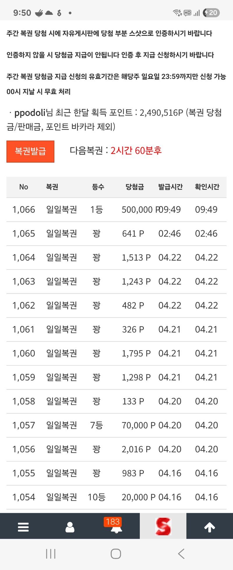 일복1등당첨 ppodoli 6 0 0 09:51:02 *기프티콘 바코드 노출 주의* <- 0 0 https://seulca1.com/bbs/board.php?bo_table=free&wr_id=3824555 Author 0 0 Lv.9 ppodoli 9 5,111,015 (27%) ppodoli님 보유 포인트 : P 3,187,010 +6 04.23 일복1등당첨 +2 04.23 출석완료 +7 04.22 토라메211배 +5 04.22 토라메295배 +3 04.22 토라메166배