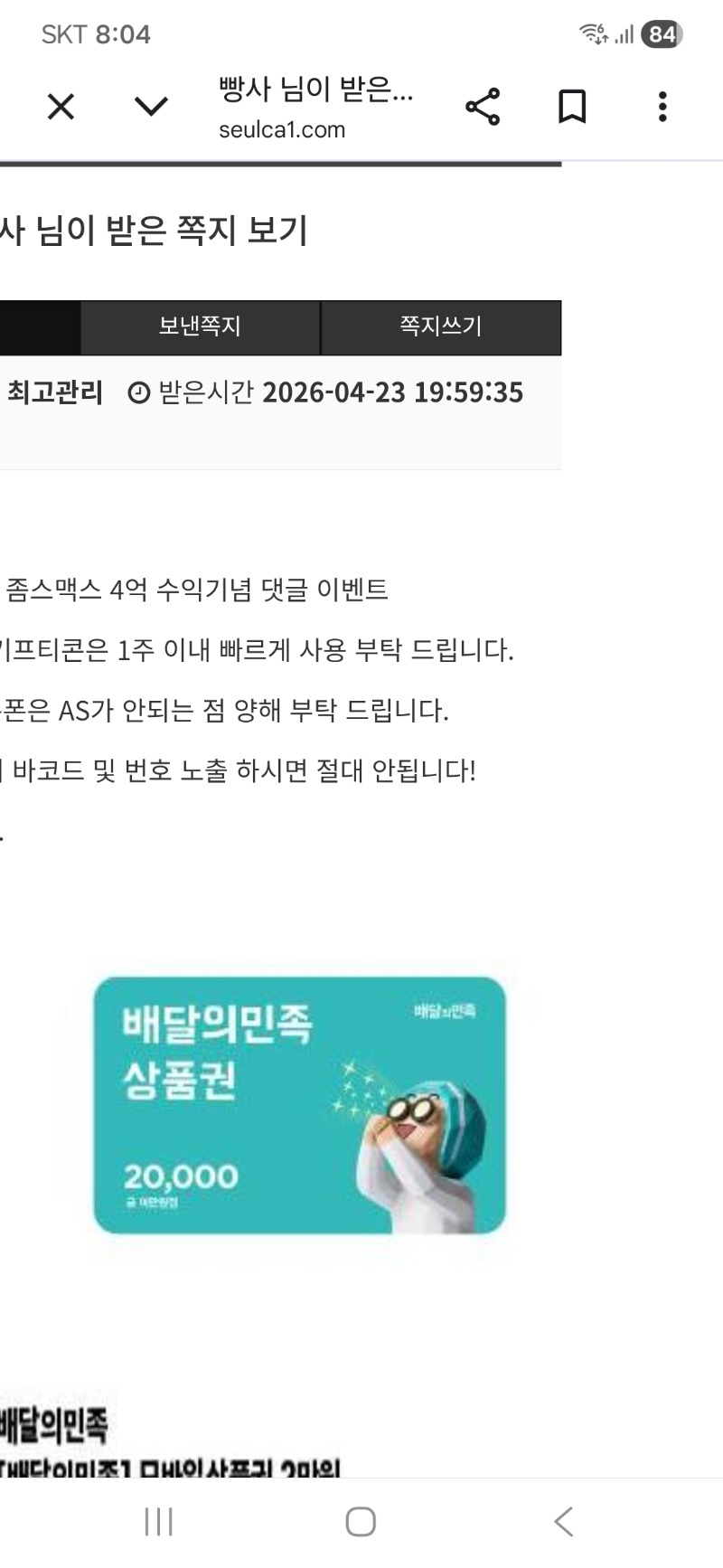 양이 맥스 배민ㅅ 빵사 2 0 0 20:07:25 *기프티콘 바코드 노출 주의* <- 형난 뱃 슬포없어서 슬포 받으려했는데 배민이 돼부넛다요.. 감사감사 0 0 https://seulca1.com/bbs/board.php?bo_table=free&wr_id=3827075 Author 3 0 Lv.17 빵사 17 84,931,863 (49%) 빵사님 보유 포인트 : P 4,300 +2 04.23 아~싸 오랜만에 받는 쪽지다~~ +2 04.23 양이 맥스 배민ㅅ +12 04.23 토라메 바닥 451배 +16 04.23 이겨도 멘징.. +16 04.23 이겼지만 배당도 없고